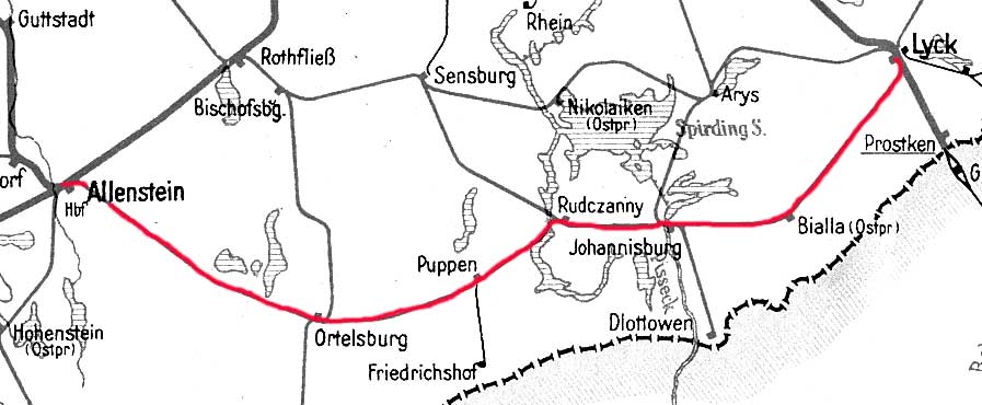 Allenstein Hbf 0,0 - Ortelsburg 44,93 - Johannisburg 101,94 - Lyck 157,42
