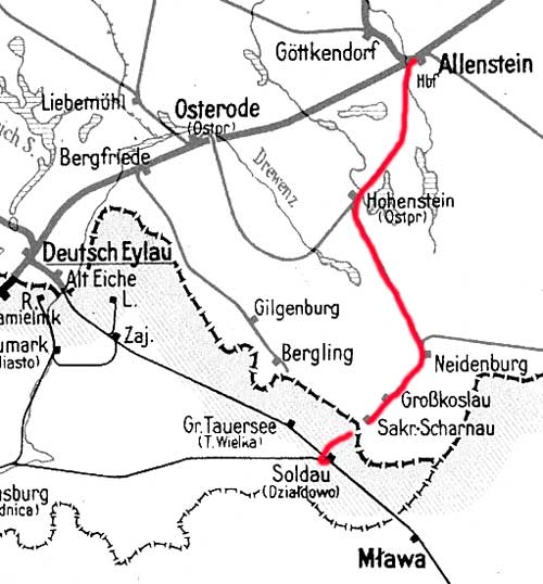 Allenstein Hbf 0,0 - Neidenburg 58,91 - Soldau (Ostpr) 83,28 (auch Angabe 83,18)