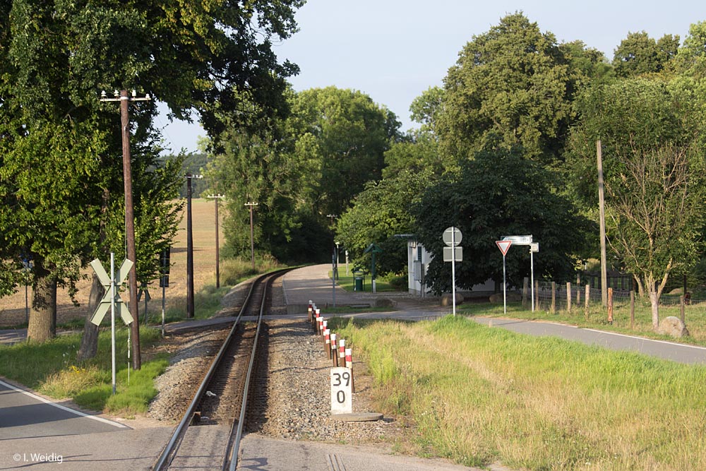 Hinter den Pfeiftafeln ist der Bahnsteig des Hp Beuchow erkennbar.