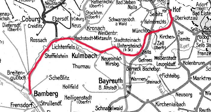 Bamberg 0,0 - Lichtenfels 31,90 - Hochstadt-Marktzeuln 40,16 - Neuenmarkt-Wirsberg 74,36 - Hof Hbf 127,23