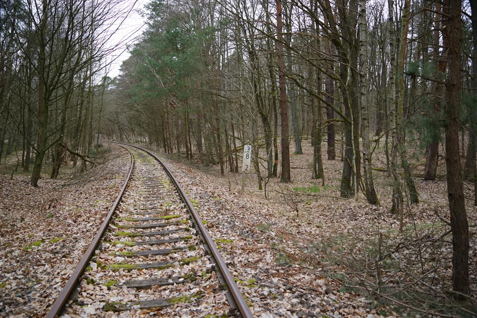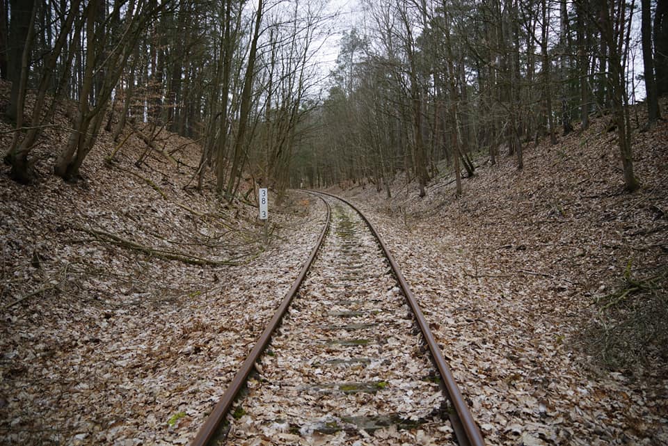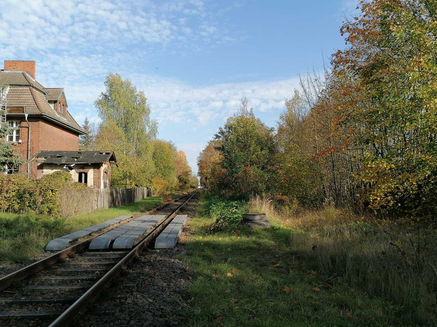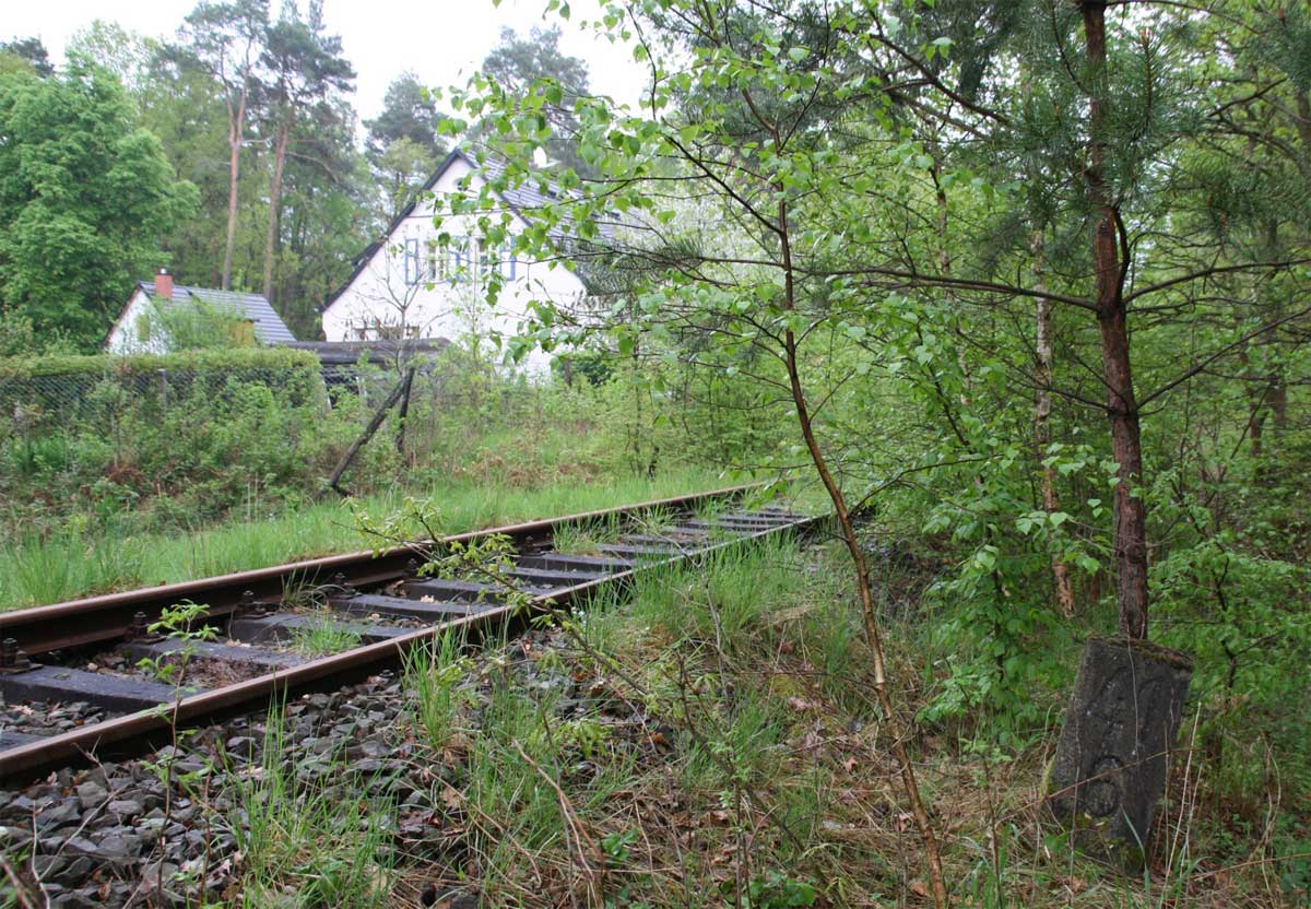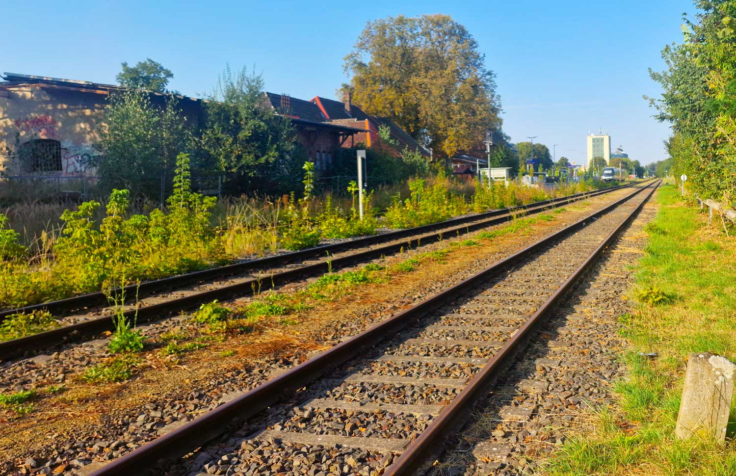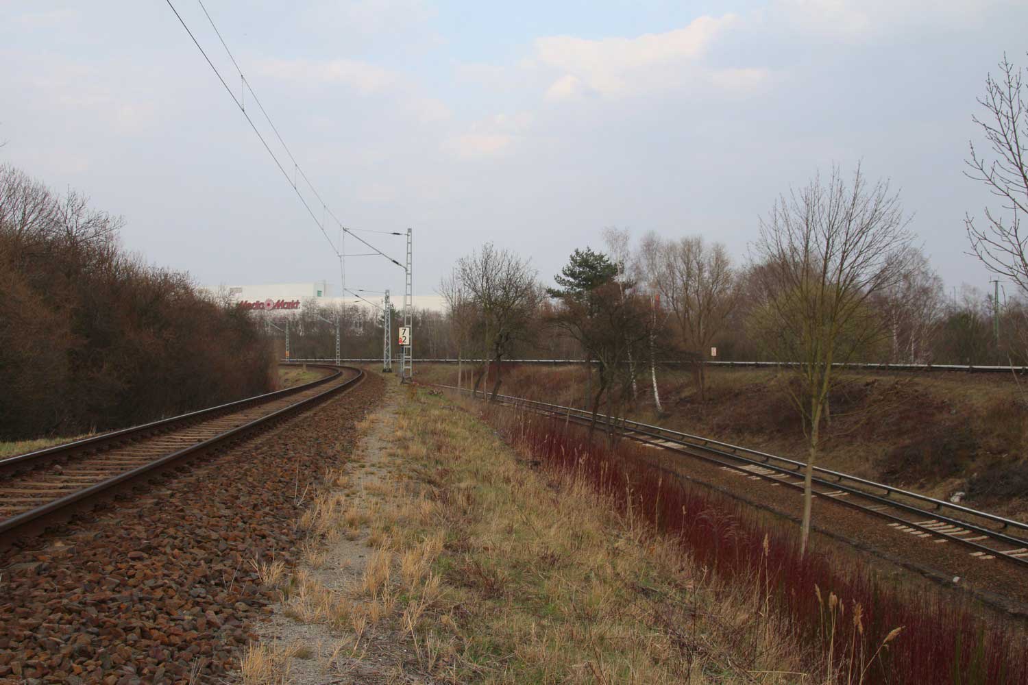 Links abgehend die ehemalige Trasse der Wriezener Bahn
