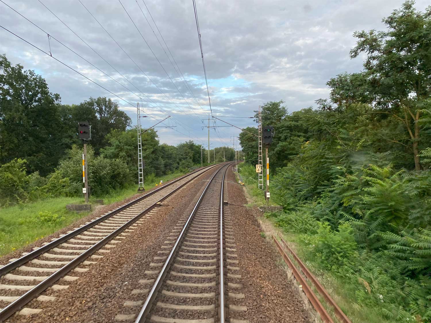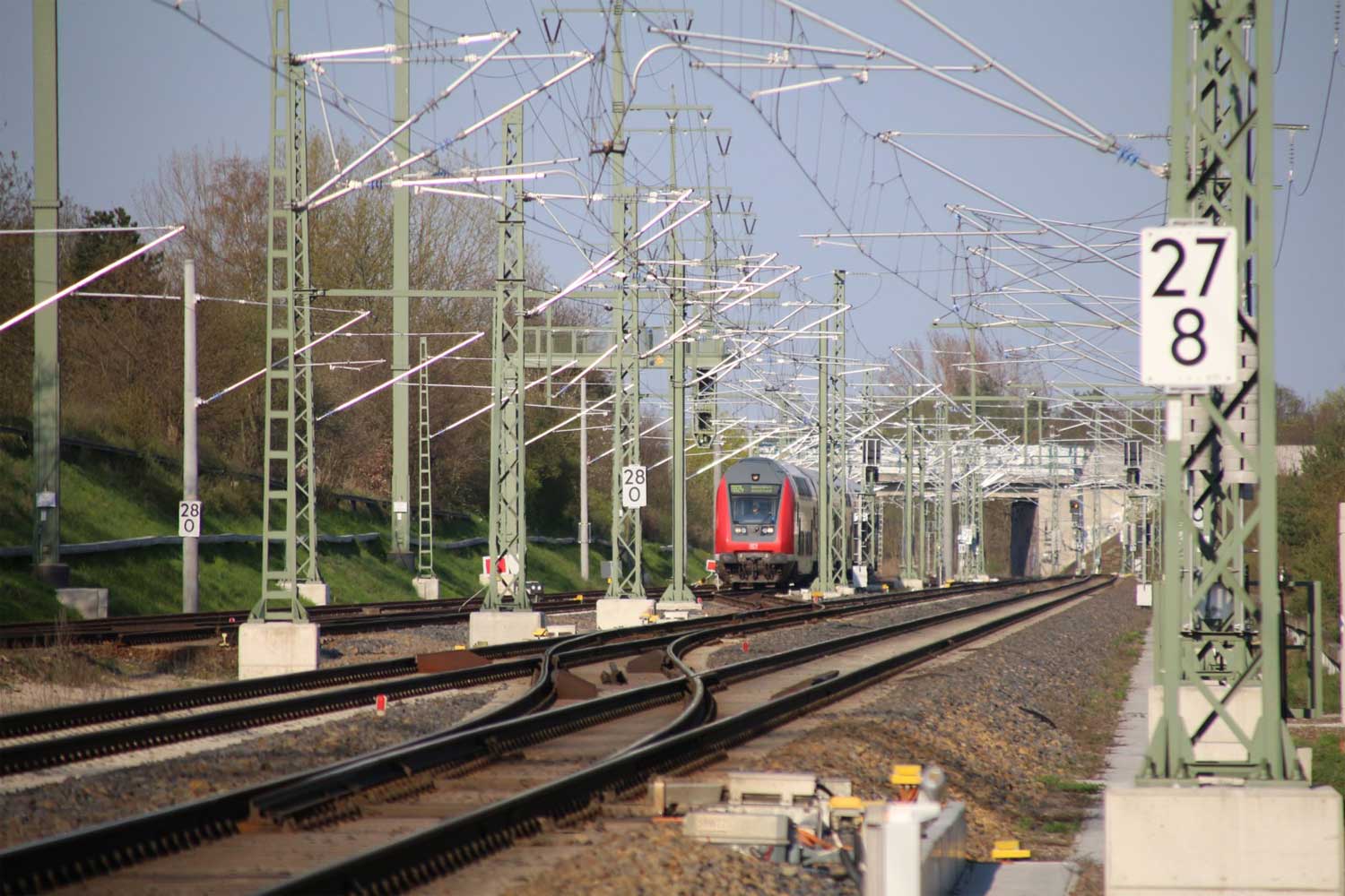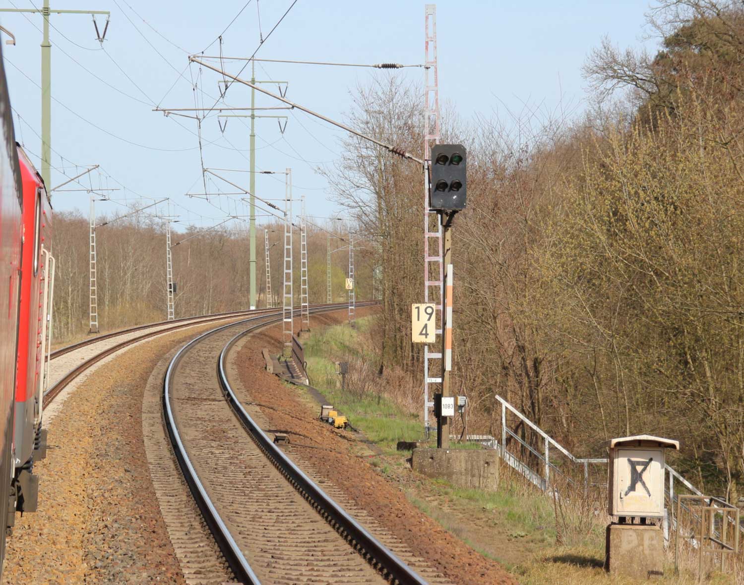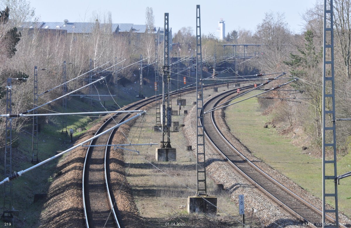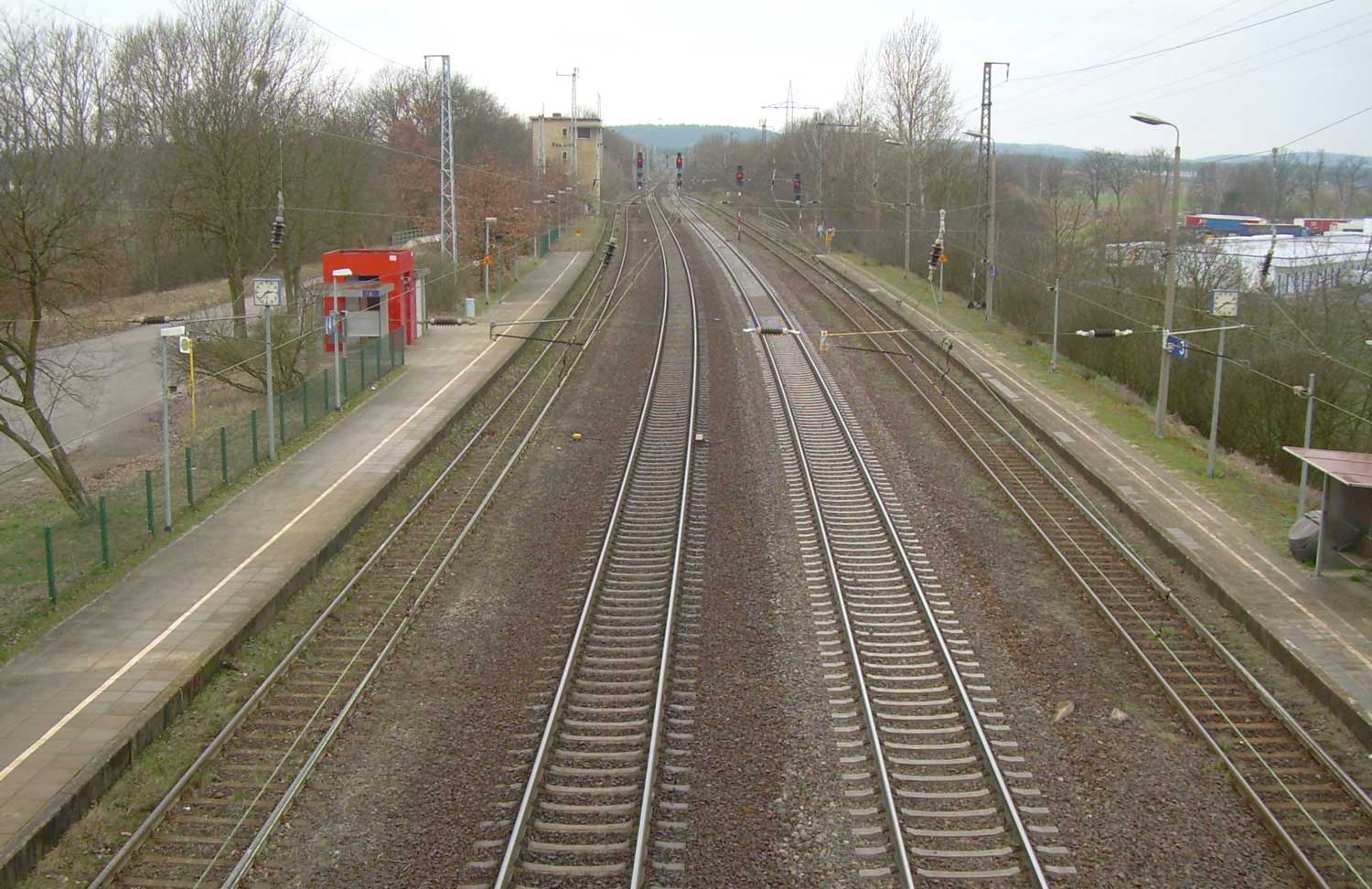 Halb rechts ankommend das Gegenrichtungsgleis (lange Kurve) der Strecke
