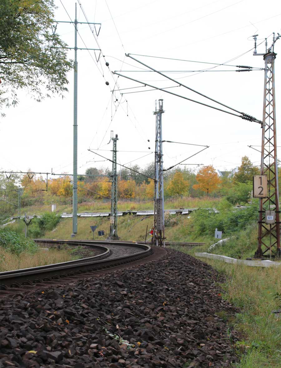 Ganz links ankommend das Richtungsgleis (kurze Kurve) der Strecke