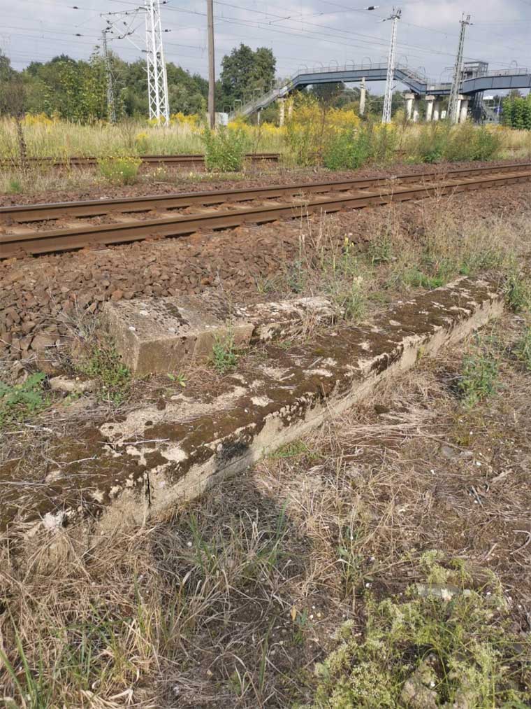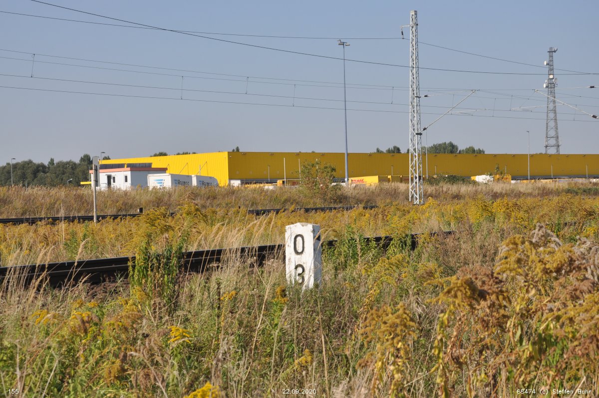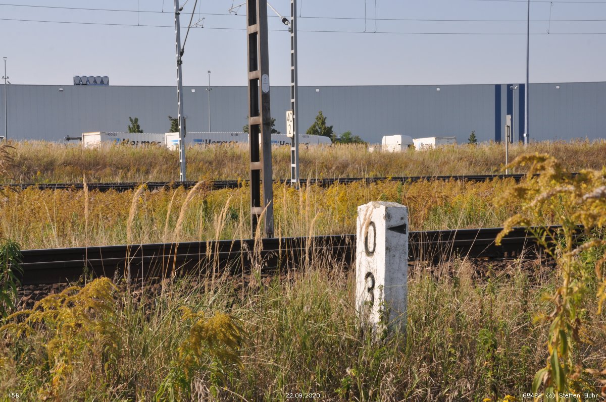 km 1,7 (liegender Stein) in Wustermark Rbf km 2,2 gehört zur Strecke Priort, W 71, km -0,21 - Wustermark Rbf, W 228, km 2,414 (6104) [früher: Abzw