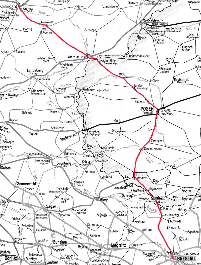 Breslau Hbf 0,06 - Grenze Deutschland/Polen 59,76 - Lissa - Posen Hbf - Grenze Polen/Deutschland 244,168 - Kreuz 248,23 - Arnswalde 303,24 - Stargard (Pom) 337,80 (1937)