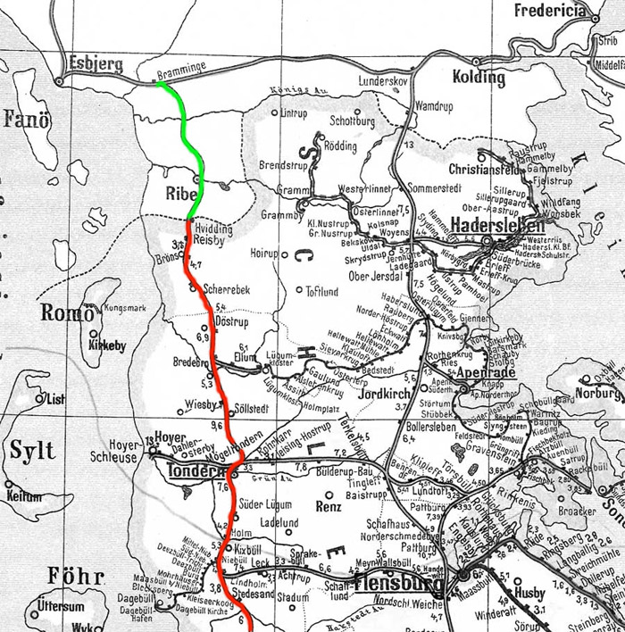| Tondern (Tønder) | 179,19 | km 0,0 der Strecke Tondern (heute: Tønder) 0,0 - Hoyerschleuse (heute: Højer Sluse) 13,78 (weiter mit Fähre zur Insel Sylt) |