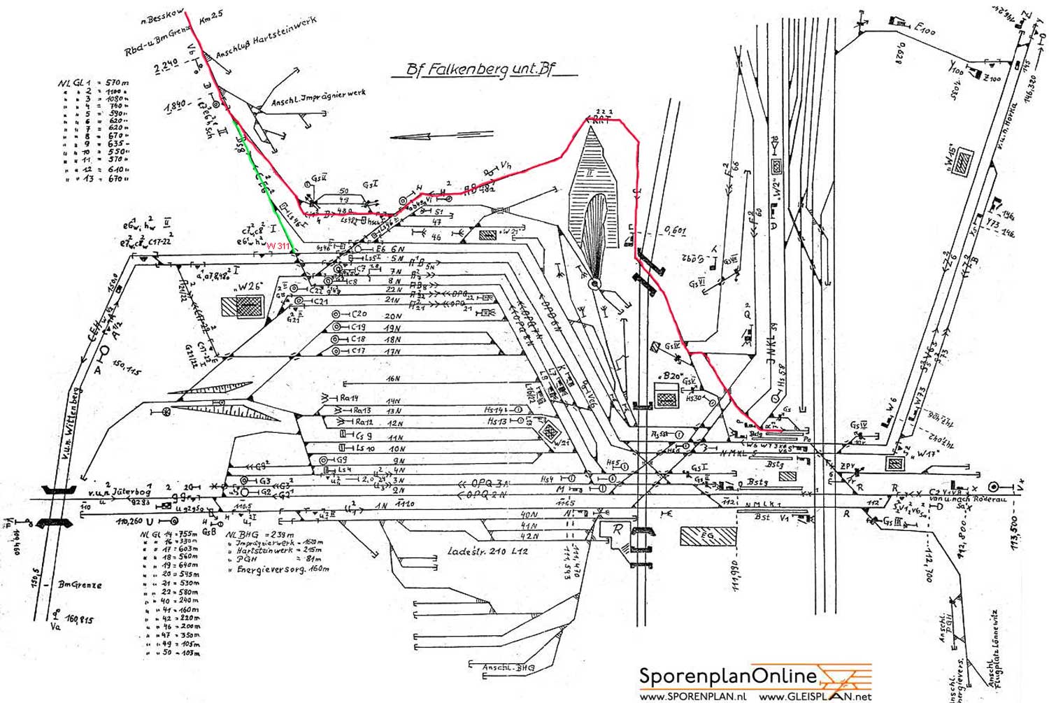 | Falkenberg (Elster) (unten) | 0,31 | km 111,94 der Strecke (Berlin Anhalter Bf -0,07) - Jüterbog 62,82 - Falkenberg 111,94 - Röderau 140,87 - Abzw. Röderau Bogendreieck 141,96 (mit Zweigstrecke von Röderau 140,87 nach Abzw. Zeithain Bogendreieck 142,06) |