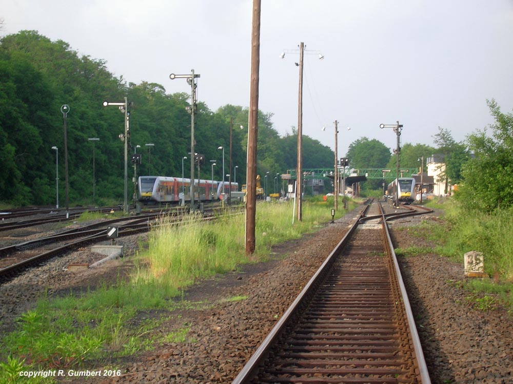 Links die Strecke Friedberg (Hess) 0,0 - Hungen 23,43 (kommend)/24,37 (gehend) - Mücke (Hess) 49,21