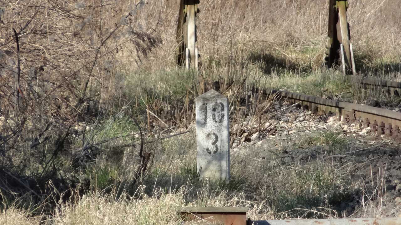 Links das Gleis der Strecke Haldensleben 0,0 - Weferlingen 31,91 mit km 1,8