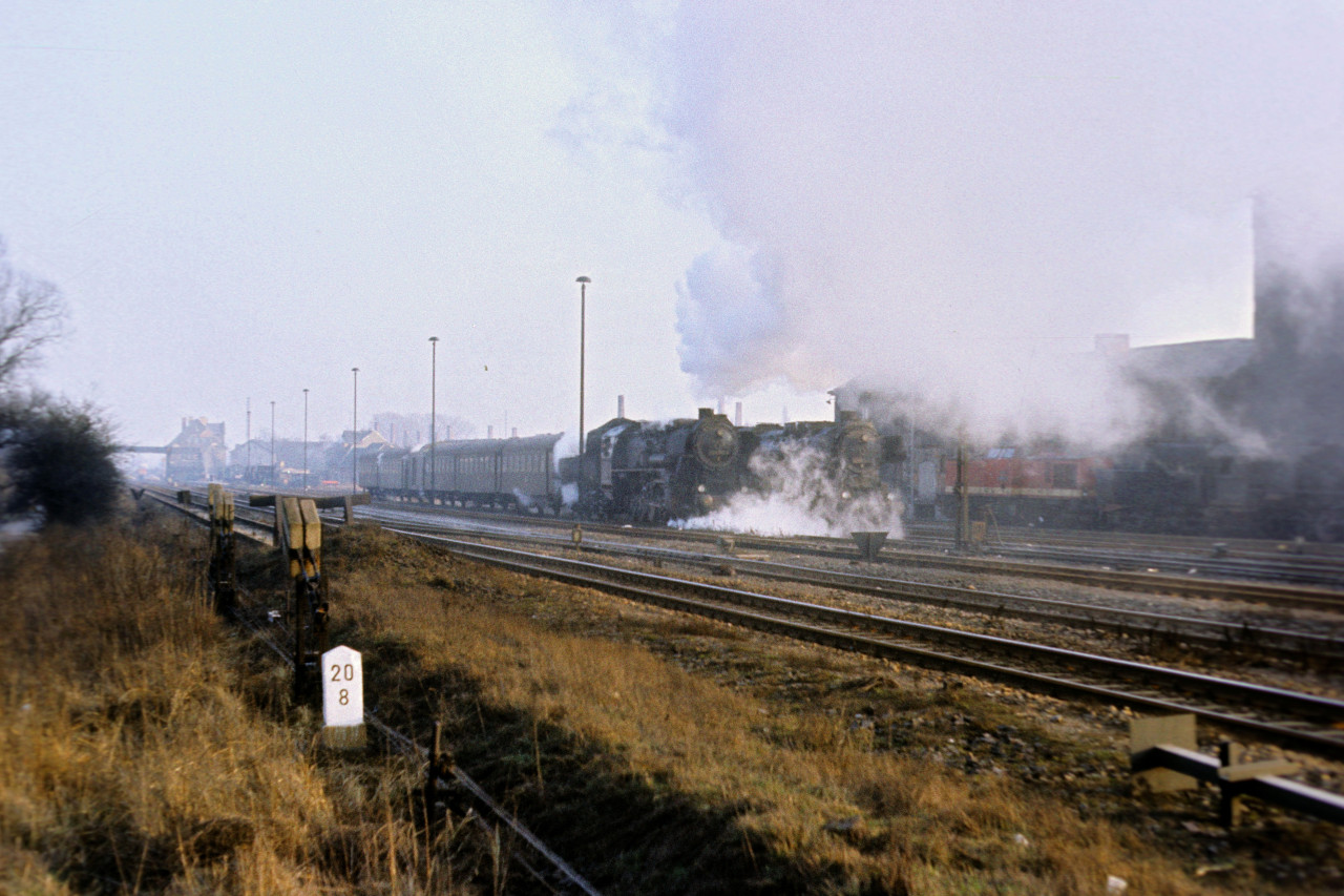 52 8150 mit Personenzug, rechts daneben 52 8144, im Hintergrund V 100 und 52 8136