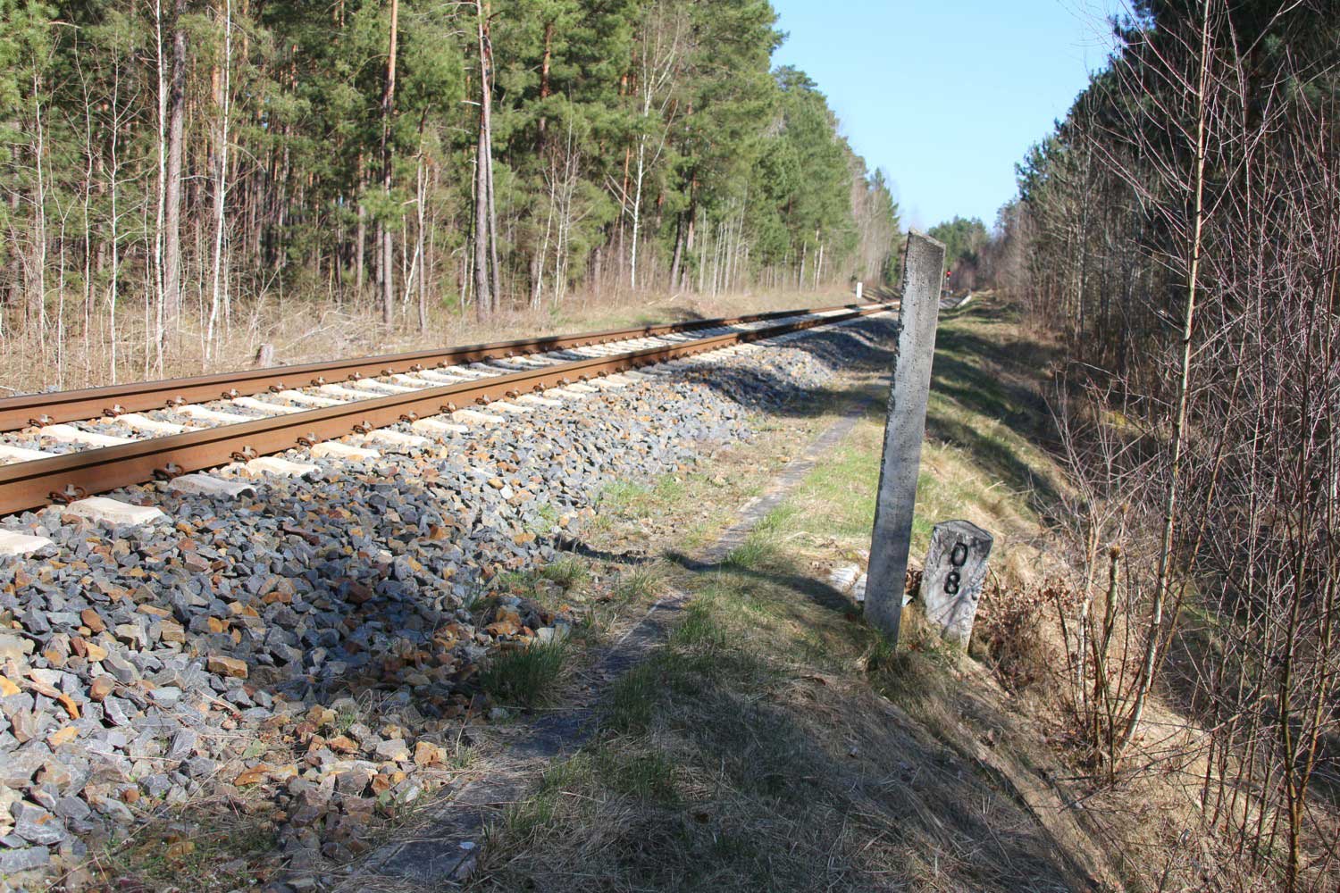 km 1,0 (Tafel und Stein) zwischen Grunow (Niederlausitz) und Schneeberg (Mark) am ehemaligen Abzw Grunow (Niederlausitz) - Blick Richtung Grunow (Niederlausitz)
