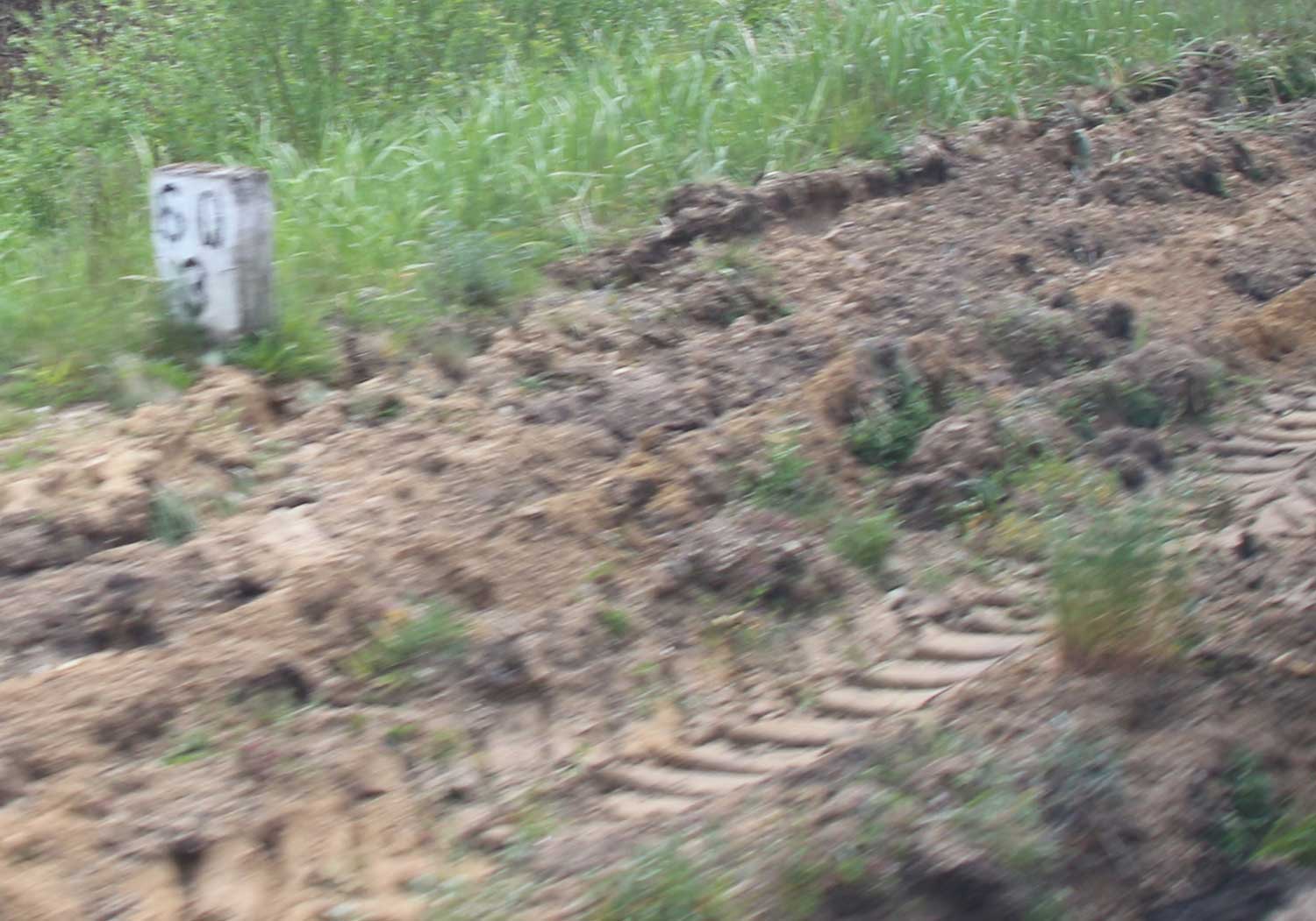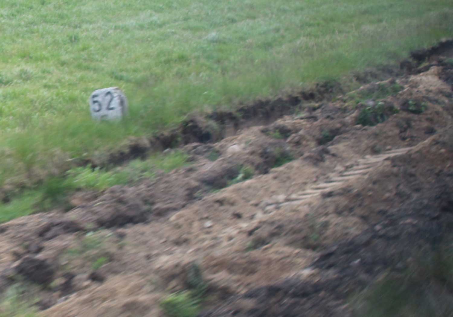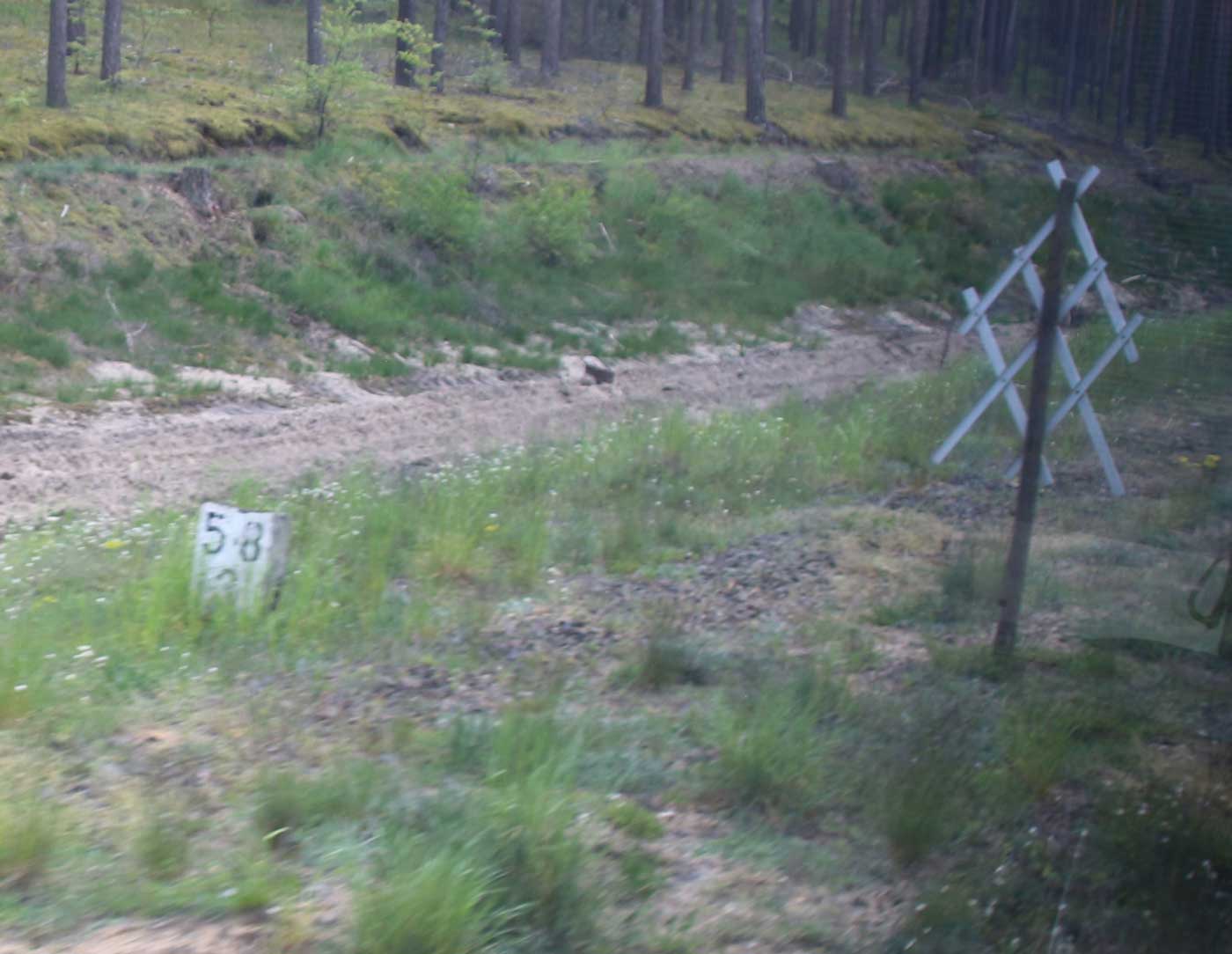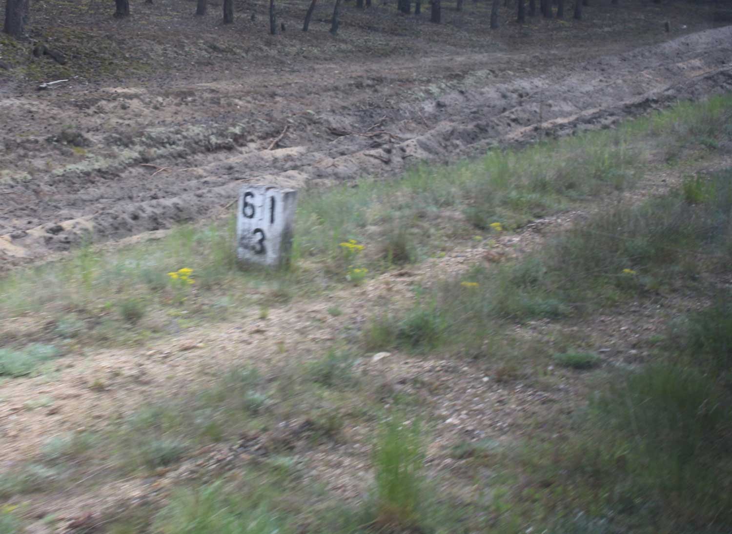 km 40,3 (Tafel und Stein) zwischen Pomorsko (Pomerzig) und Czerwieńsk [Rothenburg (Oder)]