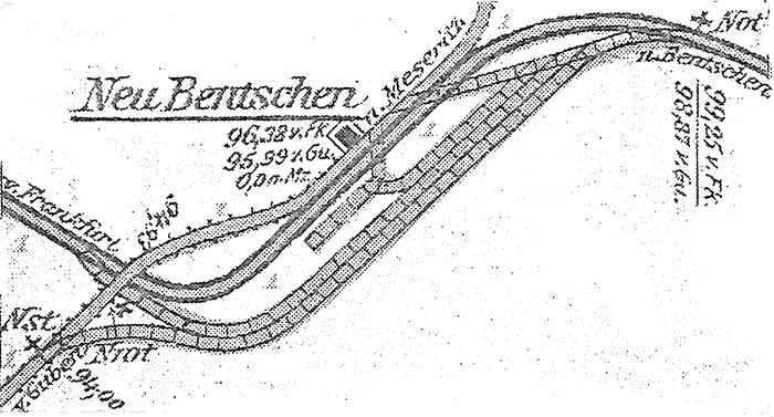| Bentschen | 99,27 | km 68,79 der Strecke Lissa (Posen) 0,0 - Wollstein 46,08 - Bentschen 68,79 - Meseritz 100,04 - Landsberg (Warthe) 144,43 |