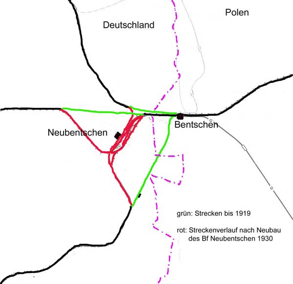 | Die Grenze des Zweiten Polnischen Republik lag westlich von Bentschen, polnisch Zbąszyń. Zbąszyń wurde polnischer Grenzbahnhof, ein großes Abfertigungsgebäude entstand. Deutscher Grenzbahnhof war zunächst Stentsch. Es gab jedoch noch mit den Strecken nach Guben und nach Landsberg zwei weitere von Bentschen ausgehende Strecken nach Deutschland. Um diese wieder zu verknüpfen, baute man zwischen den Strecken den neuen Bahnhof Neu Bentschen und verlegte die Strecken so, dass sie in den neuen Bahnhof eingeführt werden konnten. Die Frankfurter Strecke wurde so zwischen Stensch und Zbąszyń nach Süden verschwenkt. Um den Bahnhof entstand der Ort Neu Bentschen mit einer Siedlung für die Bahnbediensten und einem Zollamt. Der Bahnhof wurde 1930 eingeweiht und die Grenzabfertigung von Stentsch dorthin verlegt. |