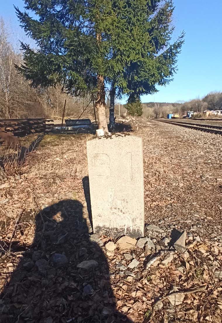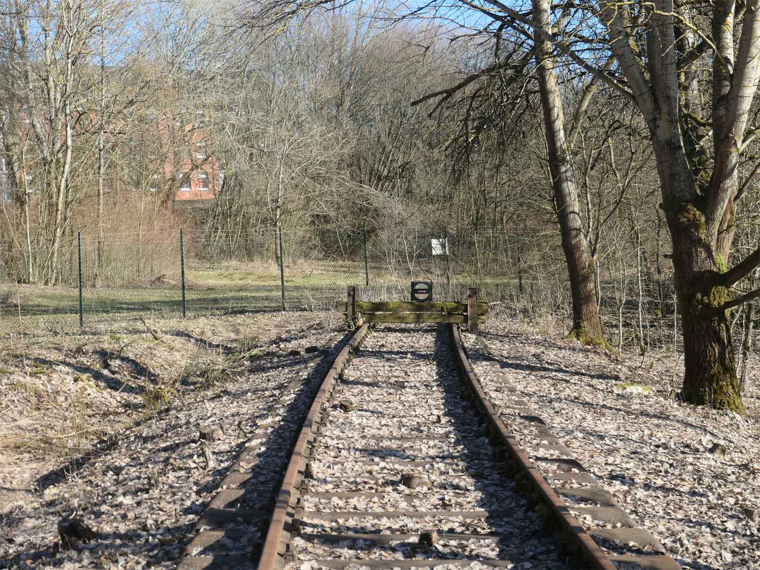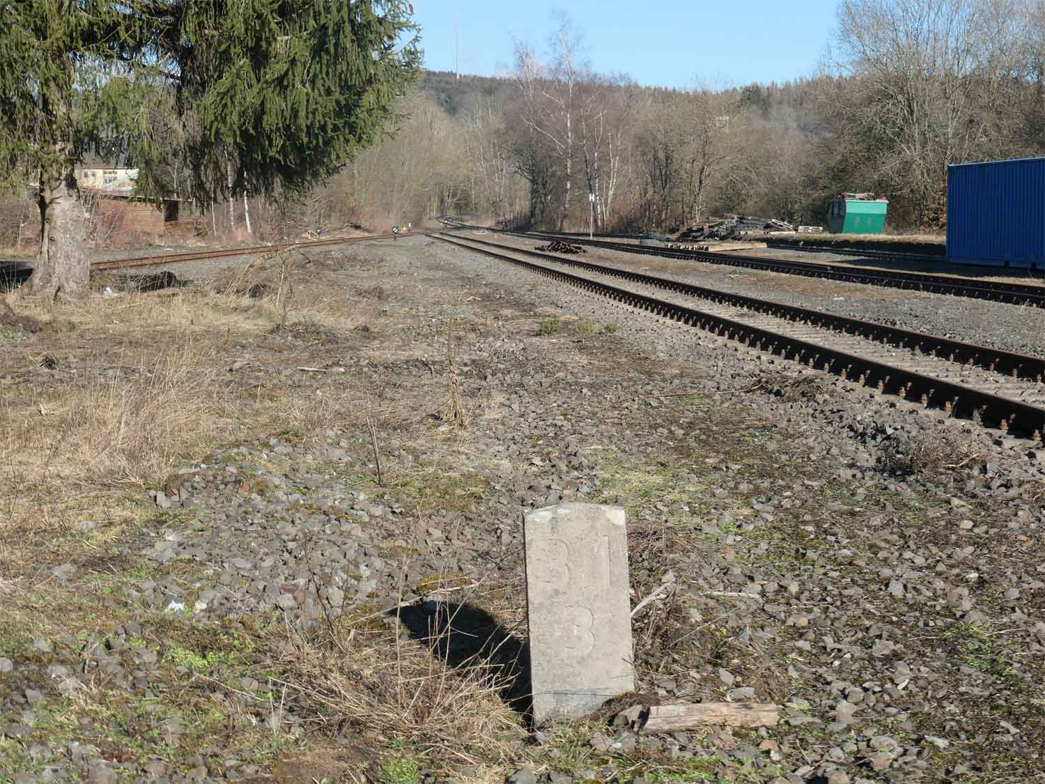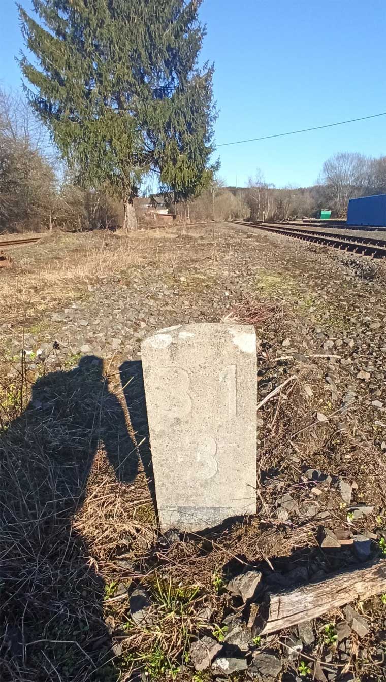 km 0,0 in Herborn (Dillkr) - Die zugehörigen Gleise lagen dereinst jenseits des Steines