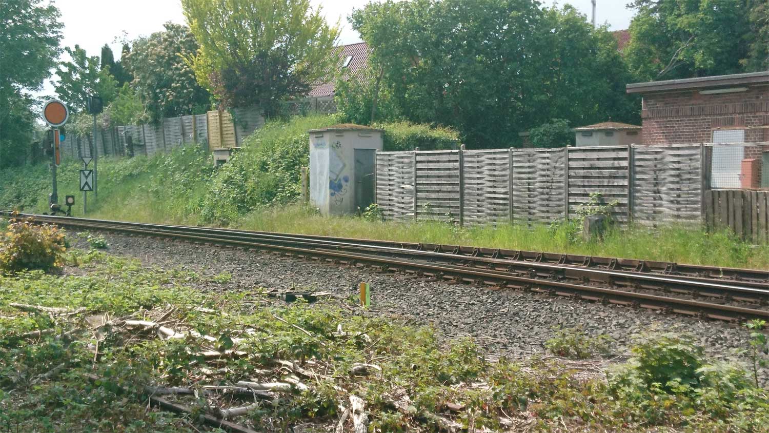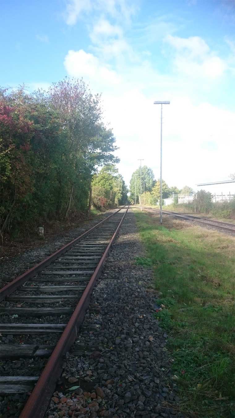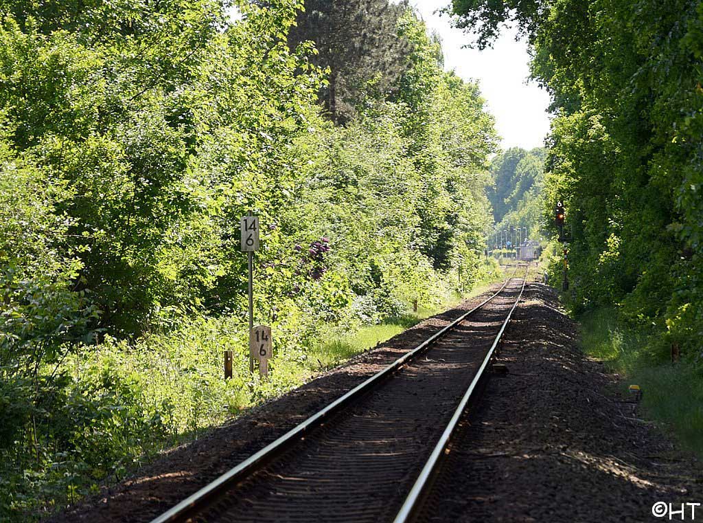 Im Vordergrund das Gleis der Strecke Eutin 0,0 - Bad Schwartau 26,93