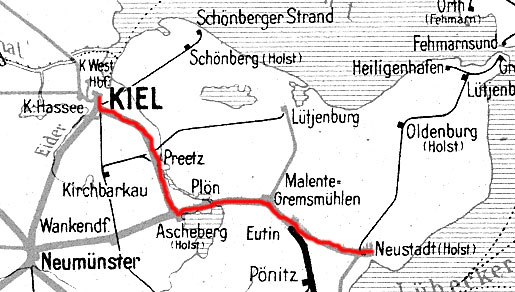 Kiel Hbf 0,0 - Ascheberg (Holst) 26,69 - Eutin 47,74 - Neustadt (Holst) Gbf 62,34 - Neustadt (Holst) 63,31 (1949)