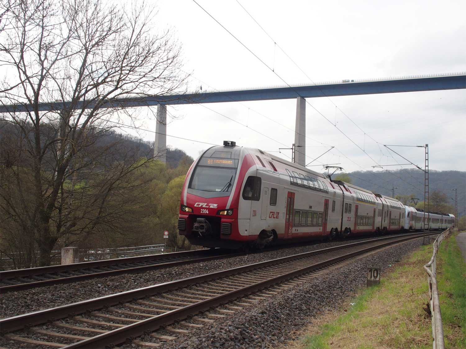 CFL 2307, 429 122, 829 122, 829 422, 829 702, 429 602 als RE 4114_5114, im Hintergrund die Moselbrücke der A 61