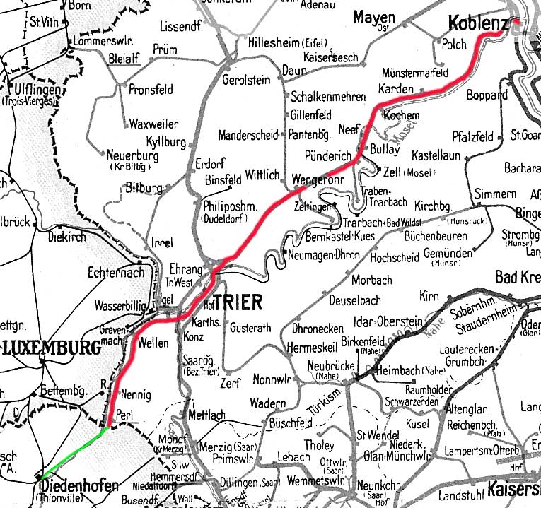 Koblenz Hbf 0,0 - Trier Hbf 111,567 - Perl 159,037 - Grenze Deutschland/Lothringen 159,512 = [km 22,176 - Apach (Lothr) 21,157 - Diedenhofen 0,0] (1914/1917)