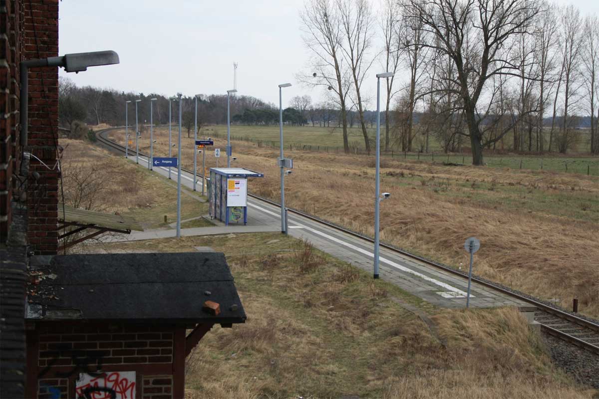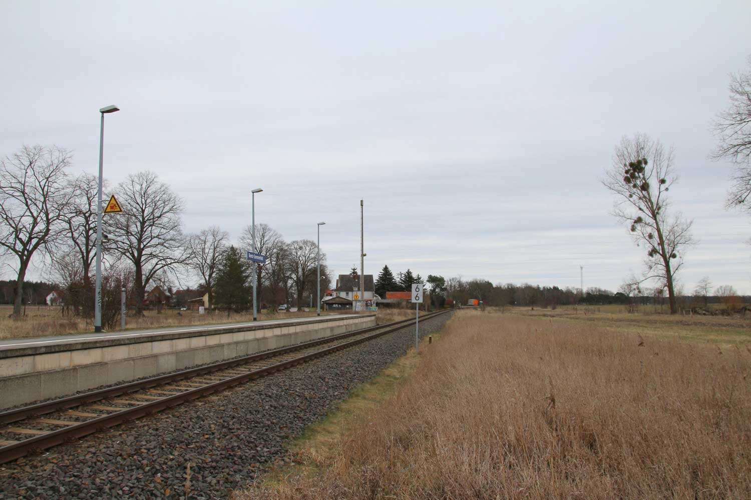 | Wittstock (Dosse) | 65,82 | km 55,47 der Strecke Wittenberge 0,0 - Perleberg 10,54 - Pritzwalk 35,41 - Wittstock (Dosse) 55,47 - ehemalige Landesgrenze Preußen/Mecklenburg (bei Buschof) km 73,25 = [km 0,0 - Buschhof 0,15 - Neustrelitz Süd 30,68 - Thurow (Meckl) 38,58 - Streckenunterbrechung bis Strasburg |