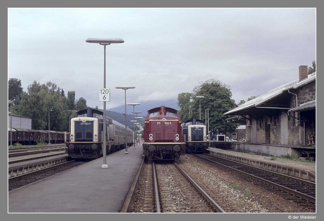 211 062 mit N 8478 nach Bodenmais, 211 024 mit N 7489 nach Plattling, 211 060 mit N 6475 nach Grafenau sowie eine unbekannte 332er als Zwieseler Bahnhofsköf