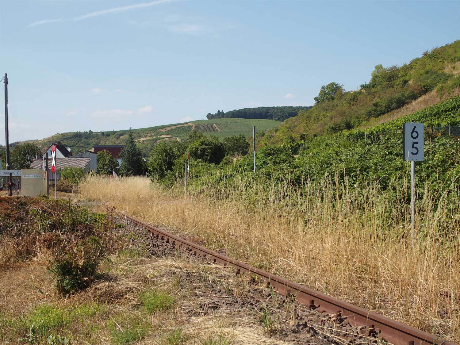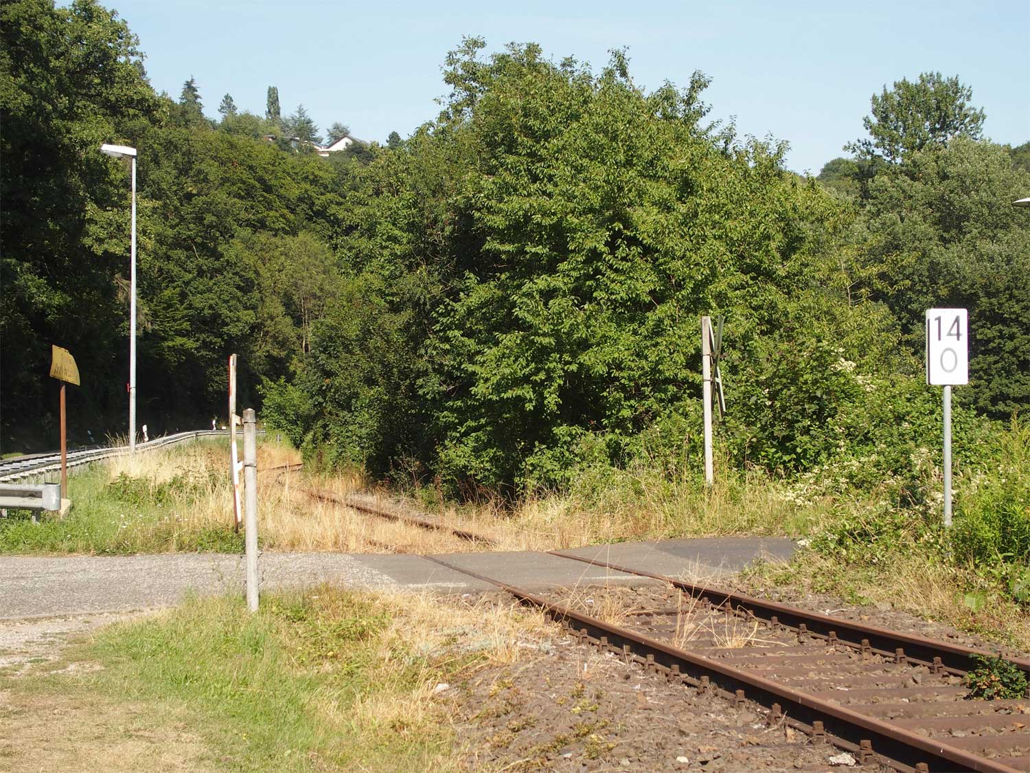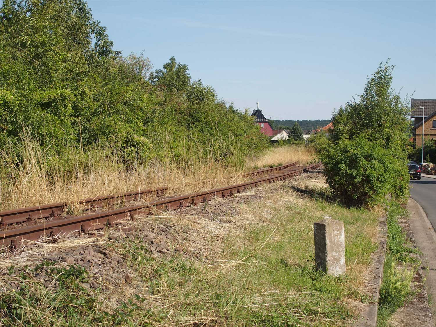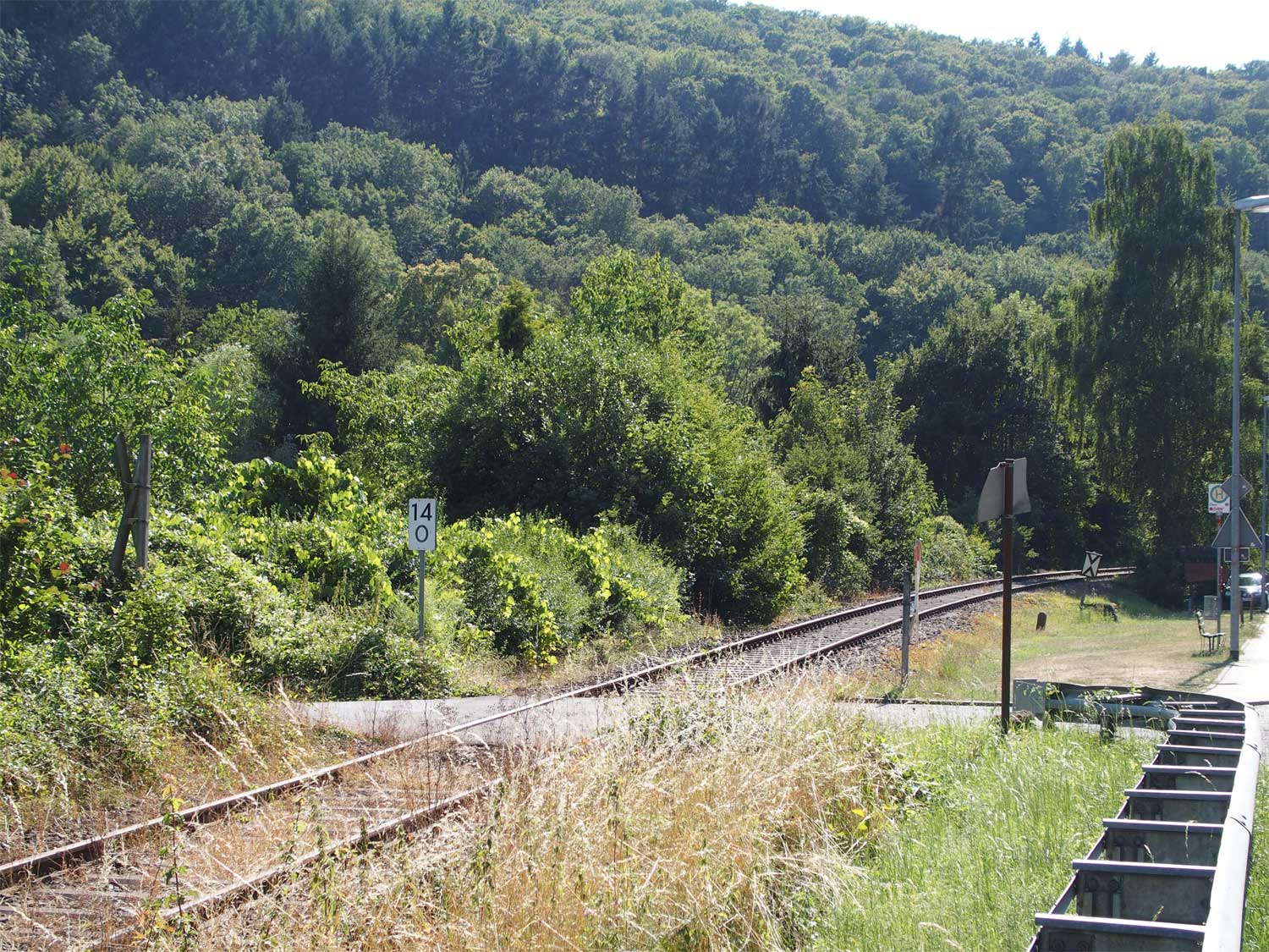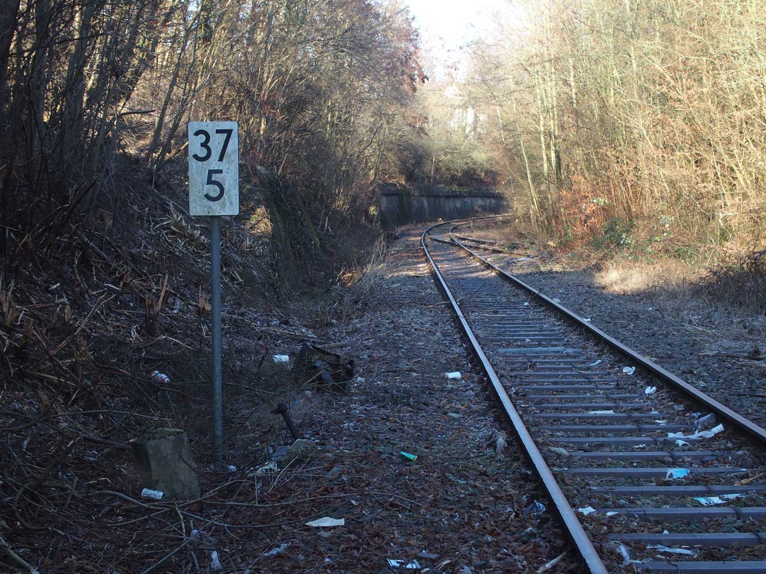 Am Beginn der Kurve ist noch schwach km 0,7 der Strecke Simmern - Boppard (3020) zu erkennen
