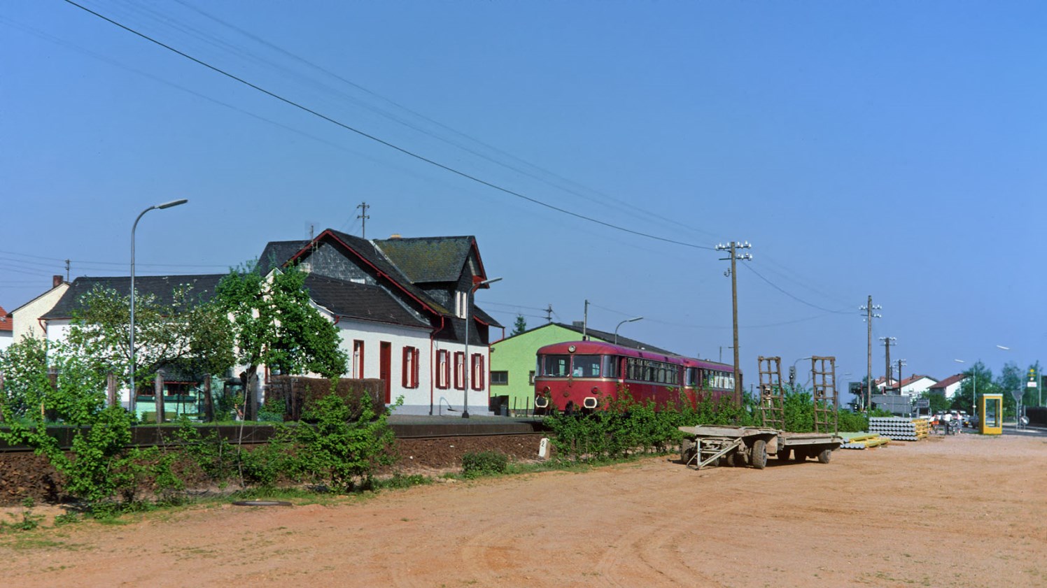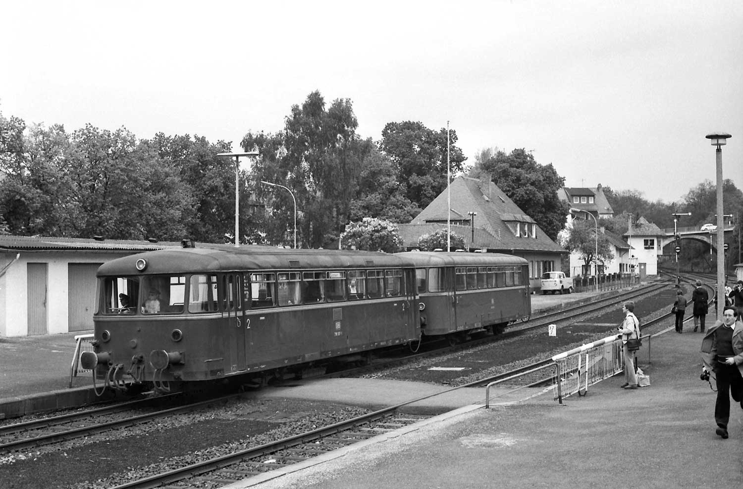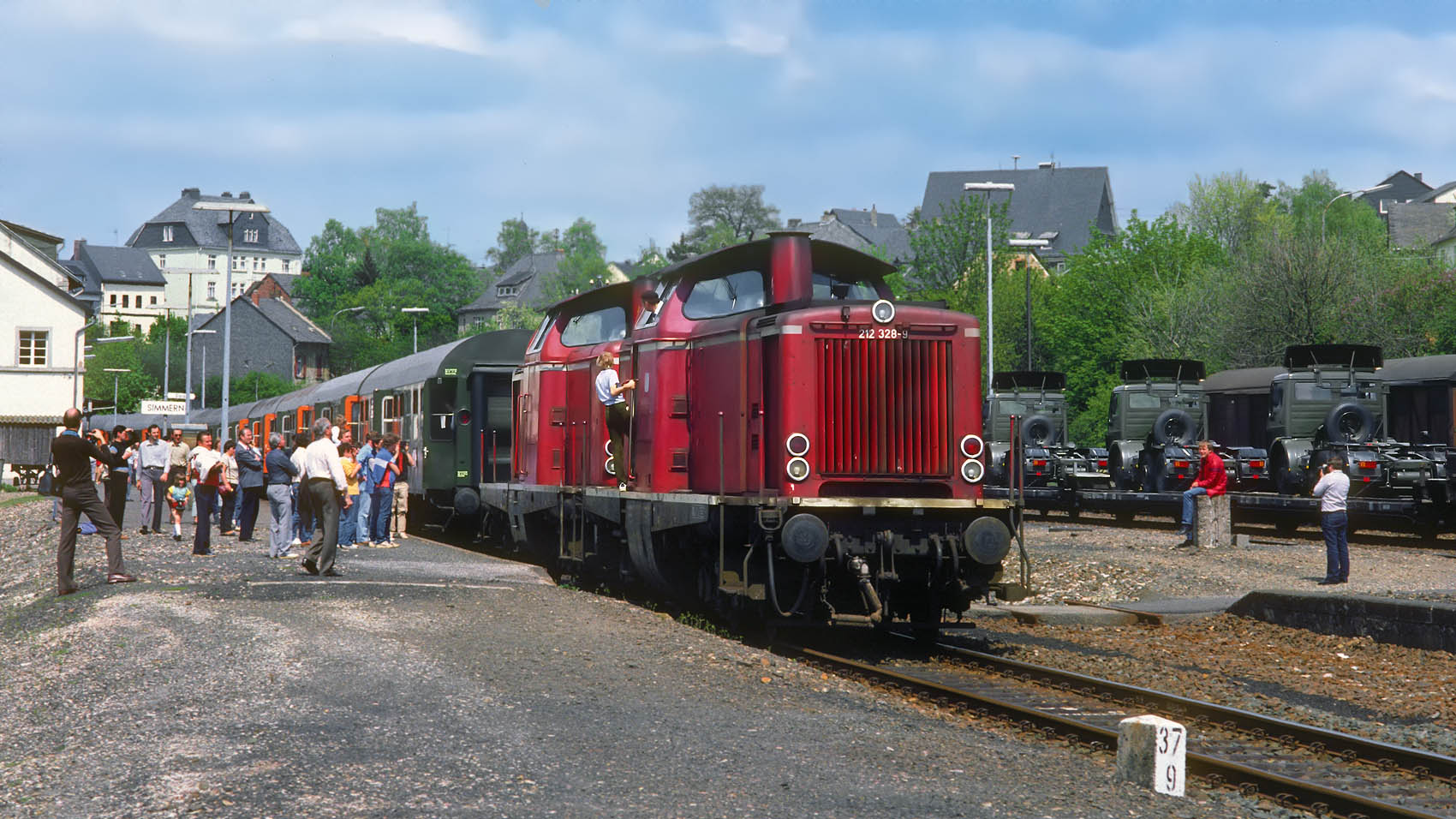 Am 20. Mai 1977 rollte gegen 13.05 Uhr auf Gleis 2 verspätet der 6879 (Boppard 11.28 – 12.59 Simmern) mit 798 540 und einem 998 an der Spitze herein.