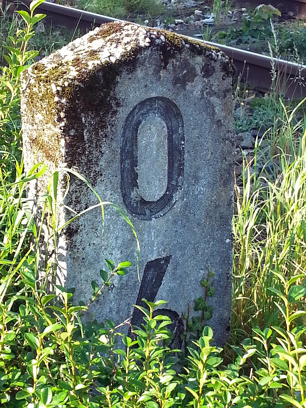 Rechts km 0,8 (Stein und Tafel) der Strecke