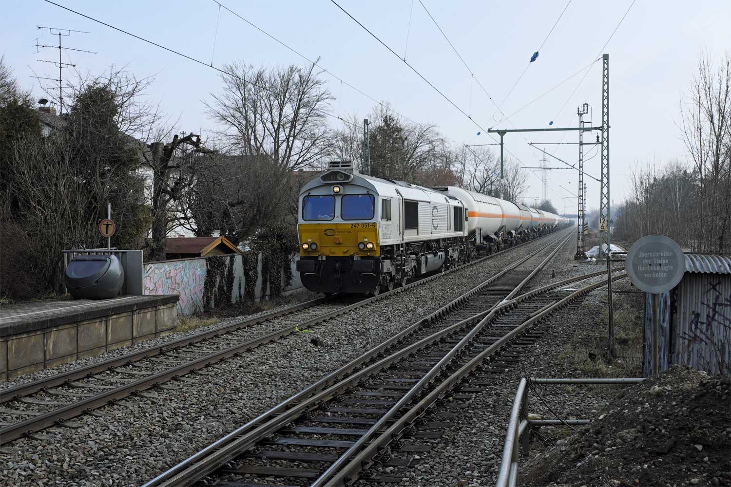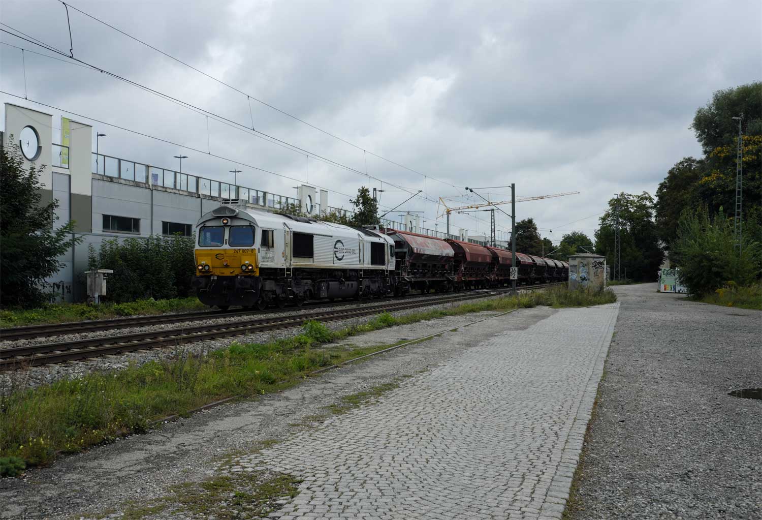Die beiden Gleise rechts gehören zur Strecke München Hbf 0,0 - Rosenheim 64,87.