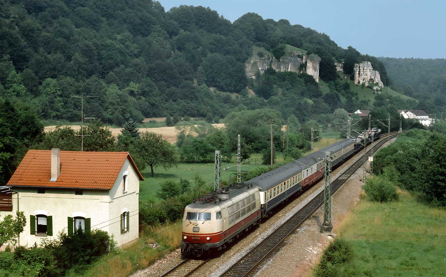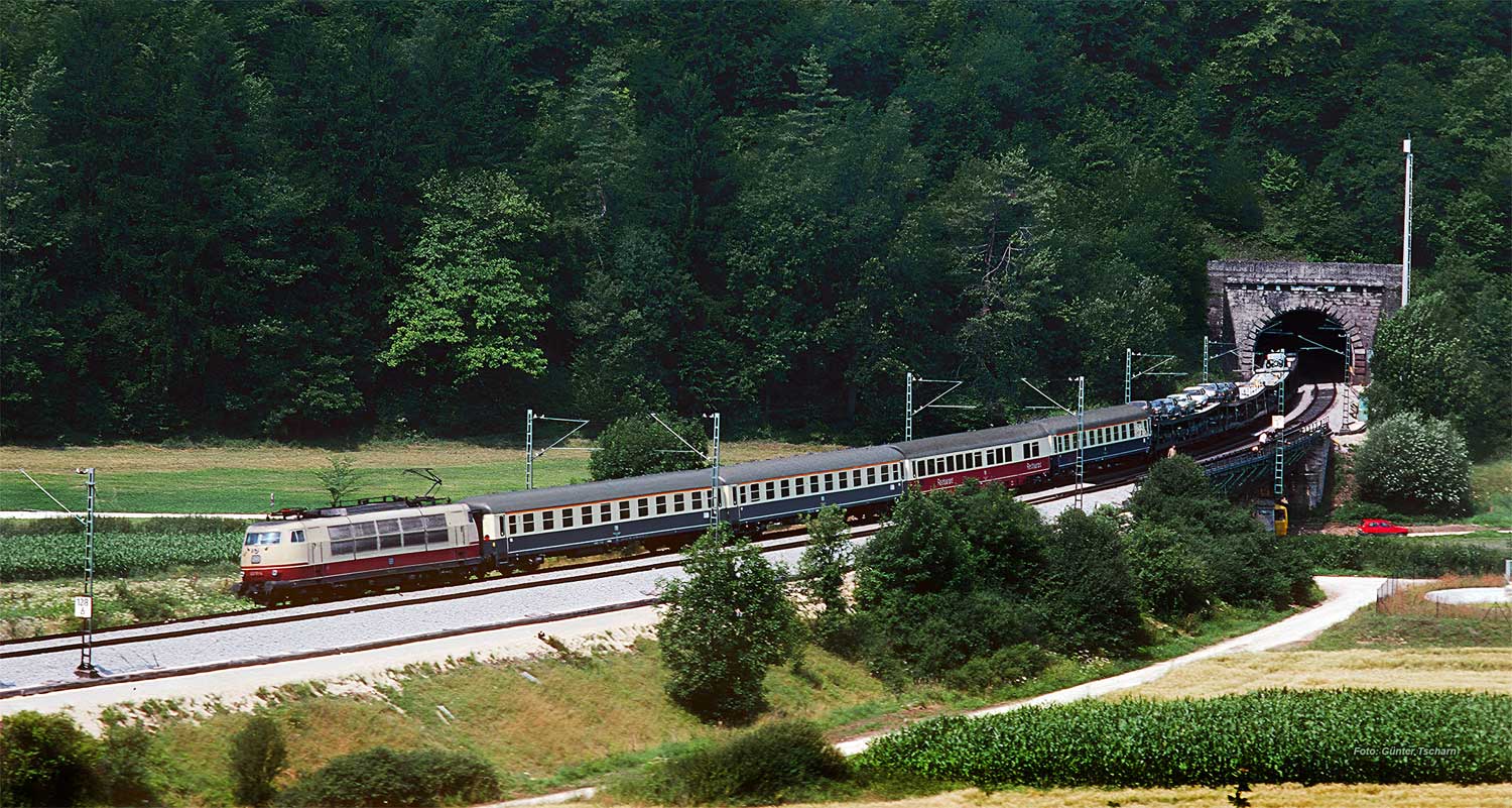 auch das Einfahrsignal. Gegen 7 Uhr kam dann die 110 363 vom Bw Hamburg-Eidelstedt mit ihrem D 1299 (Würzburg 5.20 – Treuchtlingen 6.45 – Ingolstadt - 8.02 München Hbf) heran. Erfreut nahmen wir den Hamburger Schlafwagen WLABmh 175 wahr. Erst zu Hause realisierte ich, dass es sich hier beim D 1299 lediglich um die vordere Zughälfte des D 299 KÄRNTEN-EXPRESS handelte (Hamburg-Altona 23.09 – 23.19 Hamburg Hbf 23.32 - 1.16 Hannover 1.27 – Bebra - 5.16 Würzburg 5.37 – 6.43 Nürnberg 6.52 – Treuchtlingen 7.28 – Augsburg – 8.47 München Hbf 9.00 – 14.47 Klagenfurt), der wegen des Umweges über Nürnberg eine dreiviertel Stunde später als der D 1299 in München ankam. Der D 1299 war am 30.07.1986 auffällig kurz: Gegenüber dem Reihungsplan sowie dem Zug am 31.07.1986 fehlten ihm zwei Schnellzugwagen der Bauart Bm. Außerdem zog am folgenden Tag die Münchener 111 012 der Zug in Reichertshofen. Mit Blick auf die Zugbildung war besonders interessant, dass in Hamburg Hbf drei Wagen an den Schluss des D 299 angehängt wurden: nämlich den jetzt auf dem Bild hinter der Lok laufenden WLABmh 175 sowie die beiden folgenden Liegewagen Bcm. Die Drei waren schon am Vortag im dänischen Helsingör auf die lange Reise nach Bayern gegangen, indem sie dort vorne dem D 395 SKANDIA-EXPRESS (Oslo 7.40 – Göteborg – Helsingör – Kopenhagen – 21.00 Puttgarden 21.25 – 23.07 Hamburg Hbf) zugefügt worden. Dieses System der Zugbildung bzw. Kurswagen fand ich ausgesprochen faszinierend. |