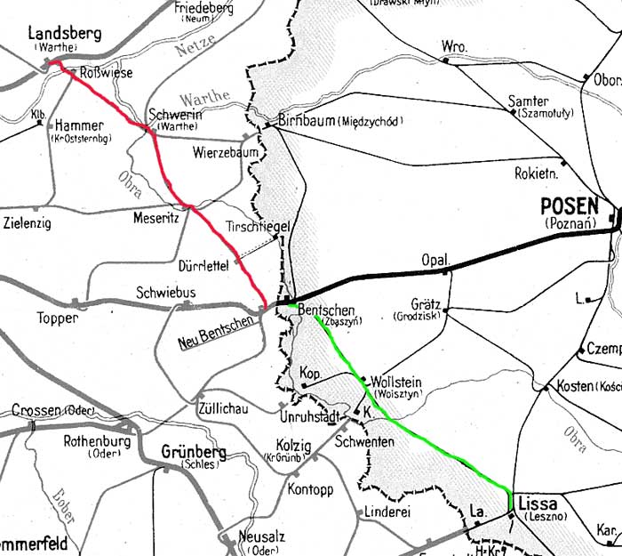 Lissa (Warthel) 0,0 - Wollstein 46,091 - Bentschen 68,872 (1943) und Neubentschen 0,0 - Meseritz 29,84 - Landsberg (Warthe) 73,69 (1943)