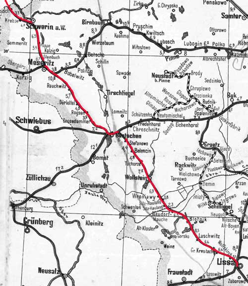 Lissa (Posen) 0,0 - Wollstein (Posen) 46,08 - Bentschen 68,79 - Meseritz 100,04 - Schwerin (Warthe) 119,14 - Landsberg (Warthe) 144,43 (1918)