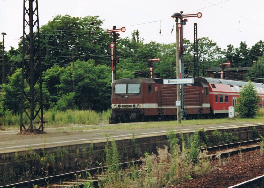Bf Borna (b Leipzig) mit km 7,0 - 143 048 mit einer S-Bahn aus Leipzig im Sommer 2002