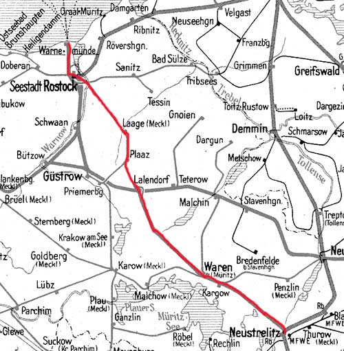 Neustrelitz 0,0 - Lalendorf Ost 70,22 - Plaaz 80,86 - Rostock Hbf 113,15 - Warnemünde 126,3