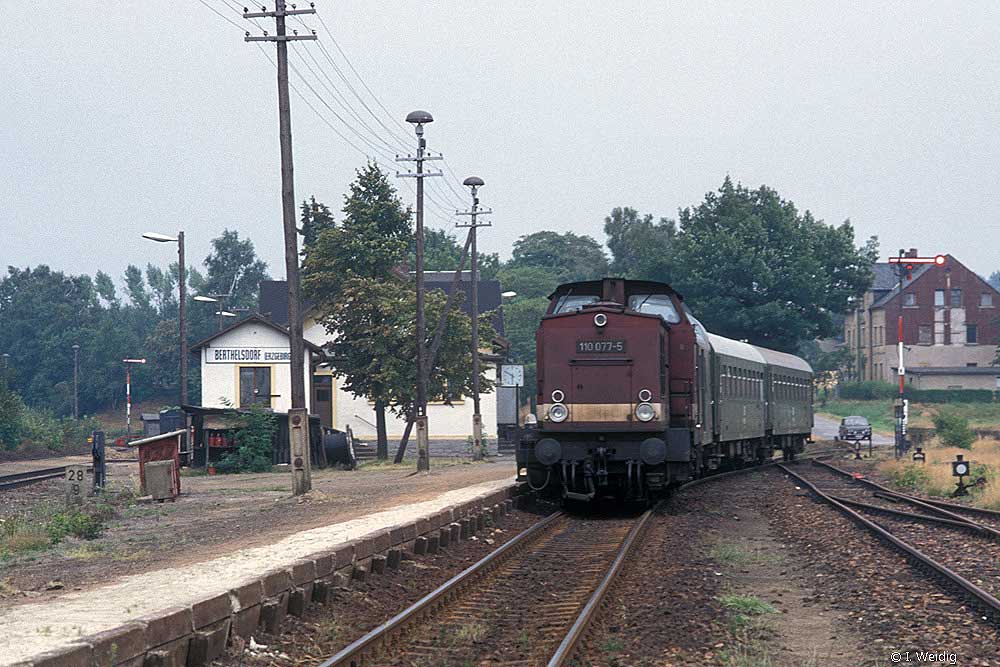 Der Zug mit der 110 077 befindet sich aber auf der Strecke Berthelsdorf (Erzgeb) 0,0 -Großhartmannsdorf 11,75 (BGh)