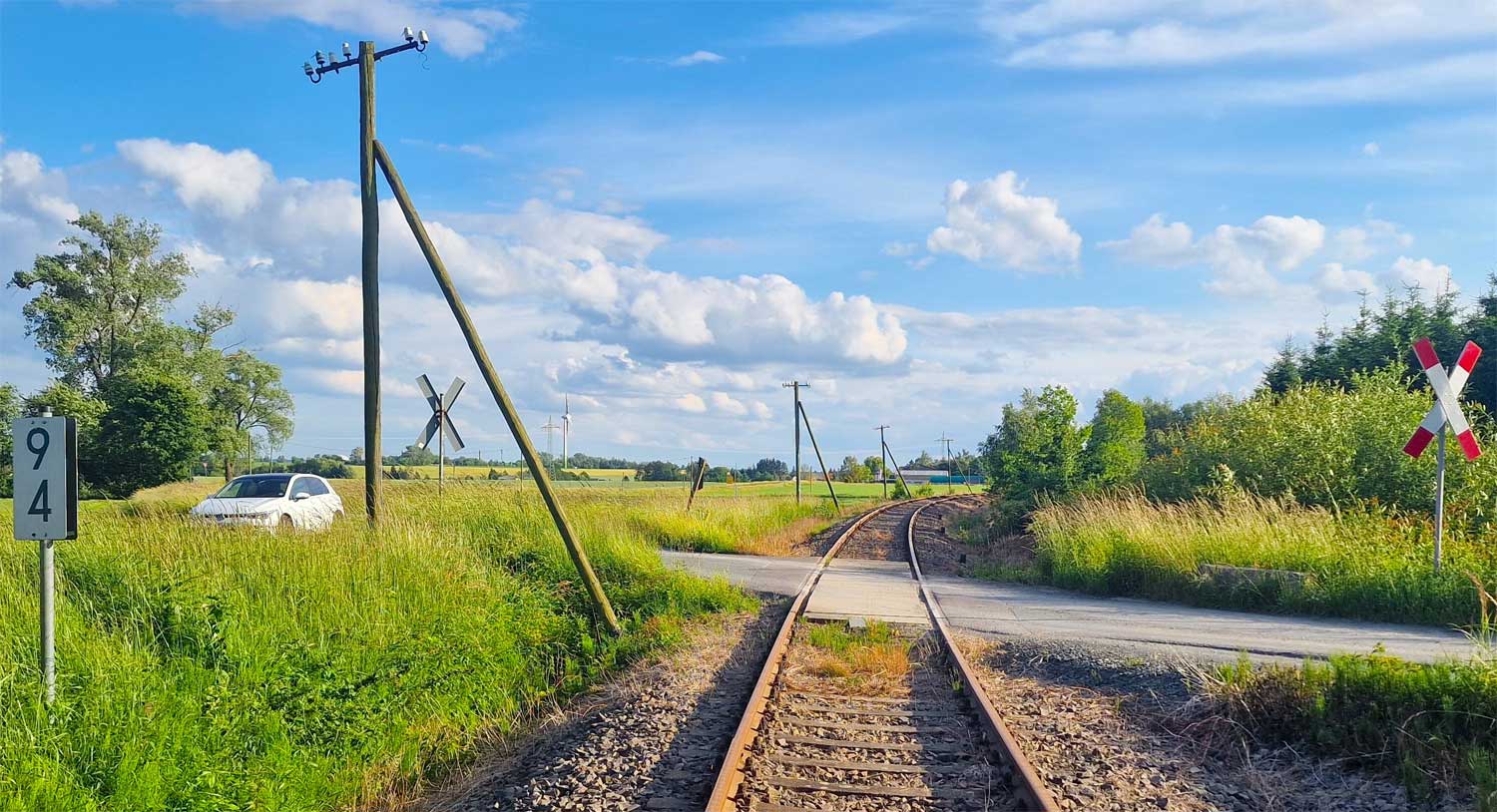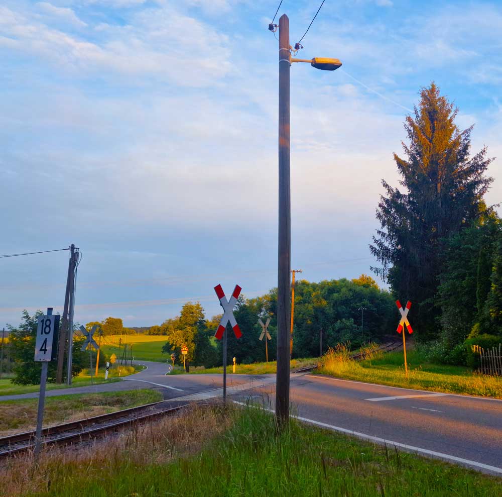 Feldweg-BÜ, Kilometerstein, F-Hütte, Grenzzeichen und Telegrafenmast - alles passt sehr gut zusammen.