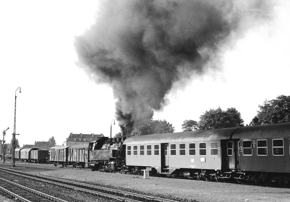 064 295 mit einer großen Rauchfahne bei der Ausfahrt Bf Kirchenlaibach mit km 93,5