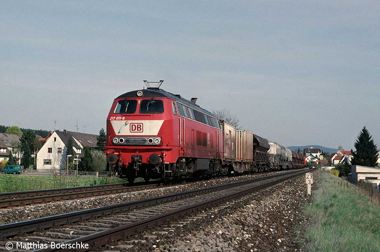 051 210 vom Bw Kirchenlaibach mit ihrem Güterzug am km 94,8