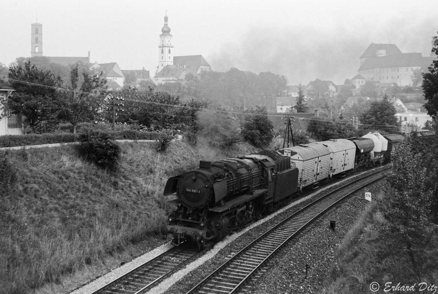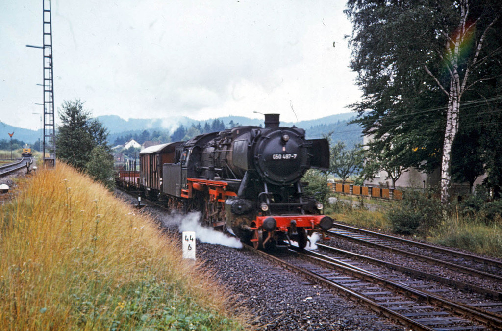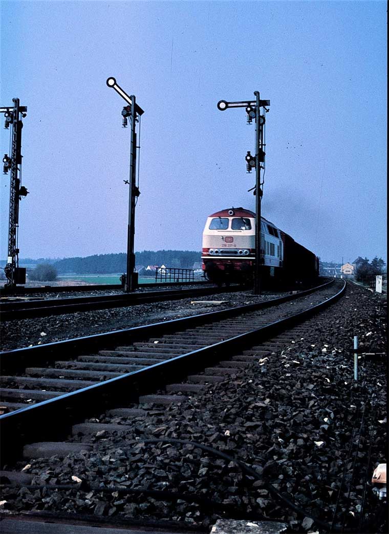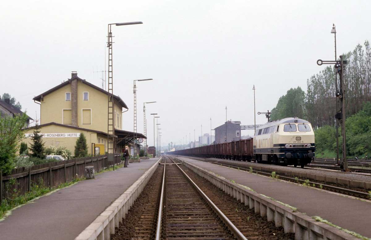 km 58,1 in Sulzbach-Rosenberg Hütte - Links am Bahnsteig 217 002, rechts mit Güterzug 217 022