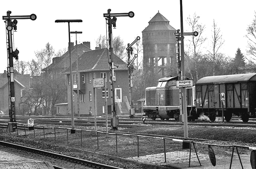 Ein Güterzug bei der Ausfahrt in Richtung Osnabrück. Im Hintergrund der Wasserturm. Der Turm ist dem Abriss entgangen. Heute dienst er, mit Zwischenetagen versehen, einer Familie als Wohnhaus.
