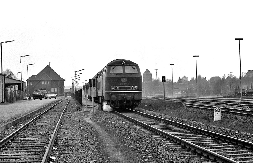 Die 216 155 mit dem E3276 verlässt den Bahnhof. Rechts ist der Wasserturm erkennbar. Das Gleis links führte zu einer kleinen Drehscheibe.