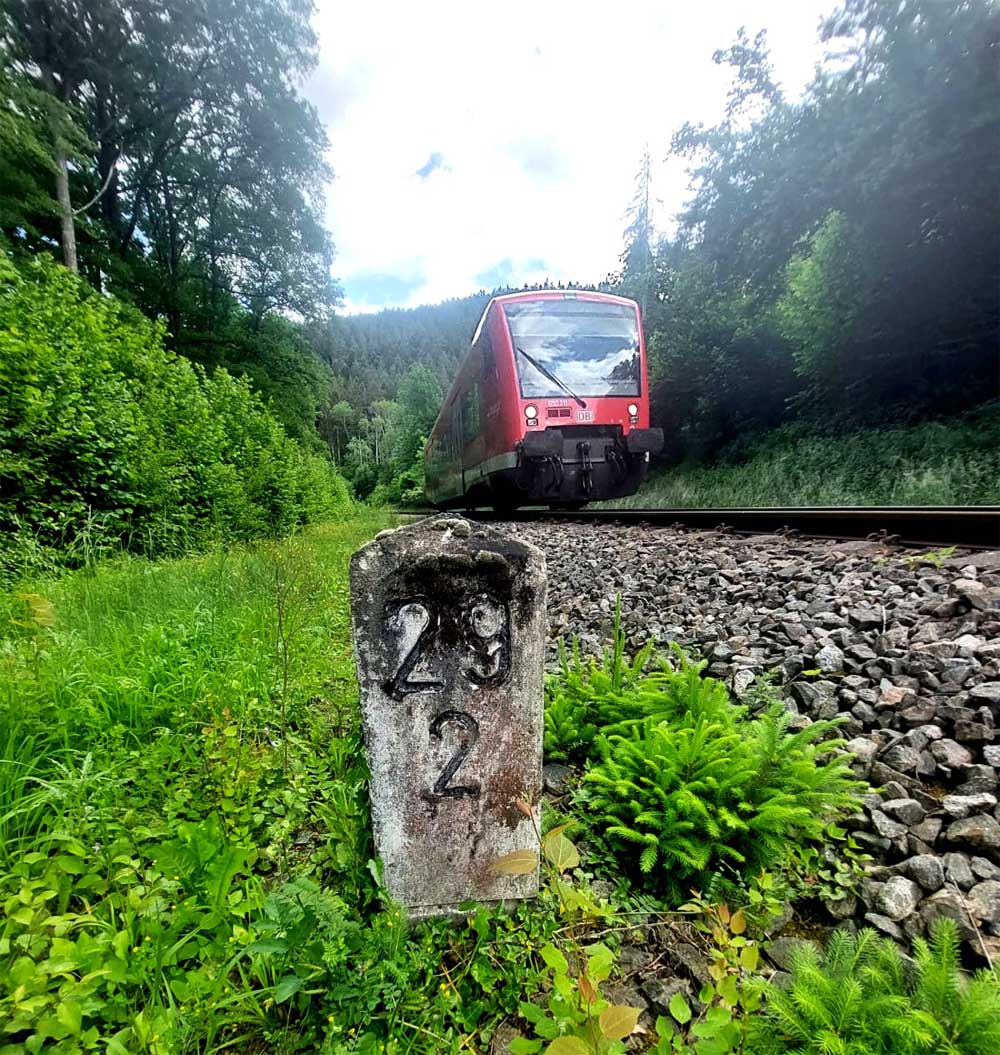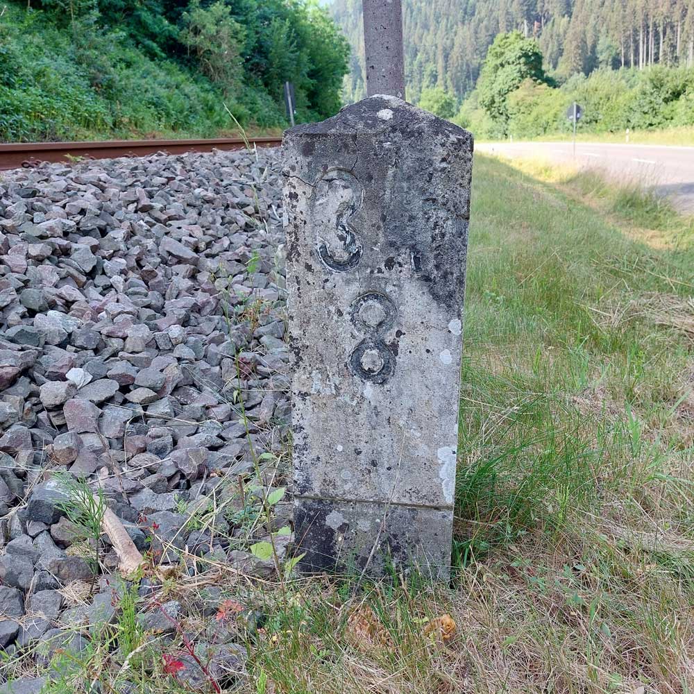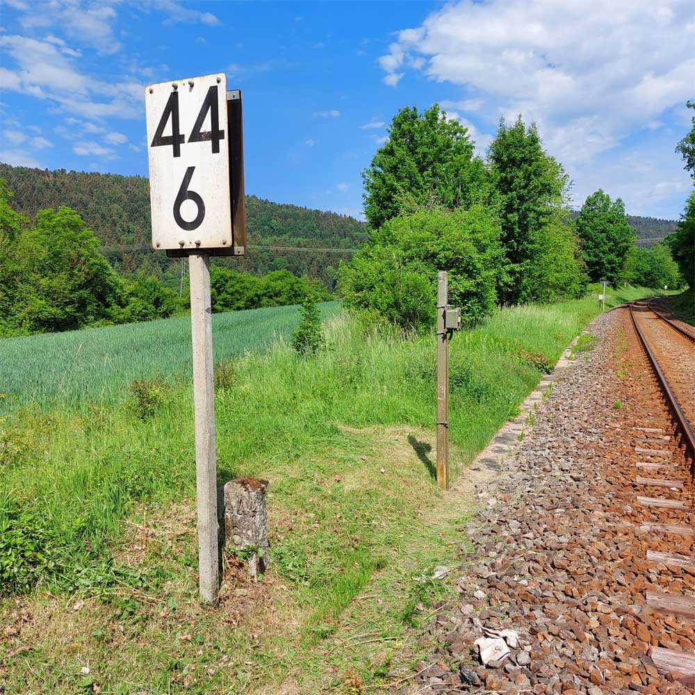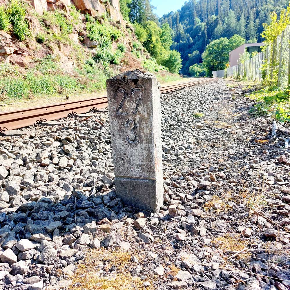 Im Hintergrund die Strecke Eutingen im Gäu - Freudenstadt Hbf - Schiltach mit der Kilometertafel 2,2