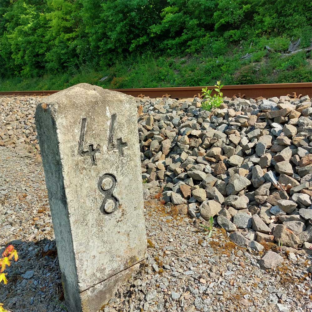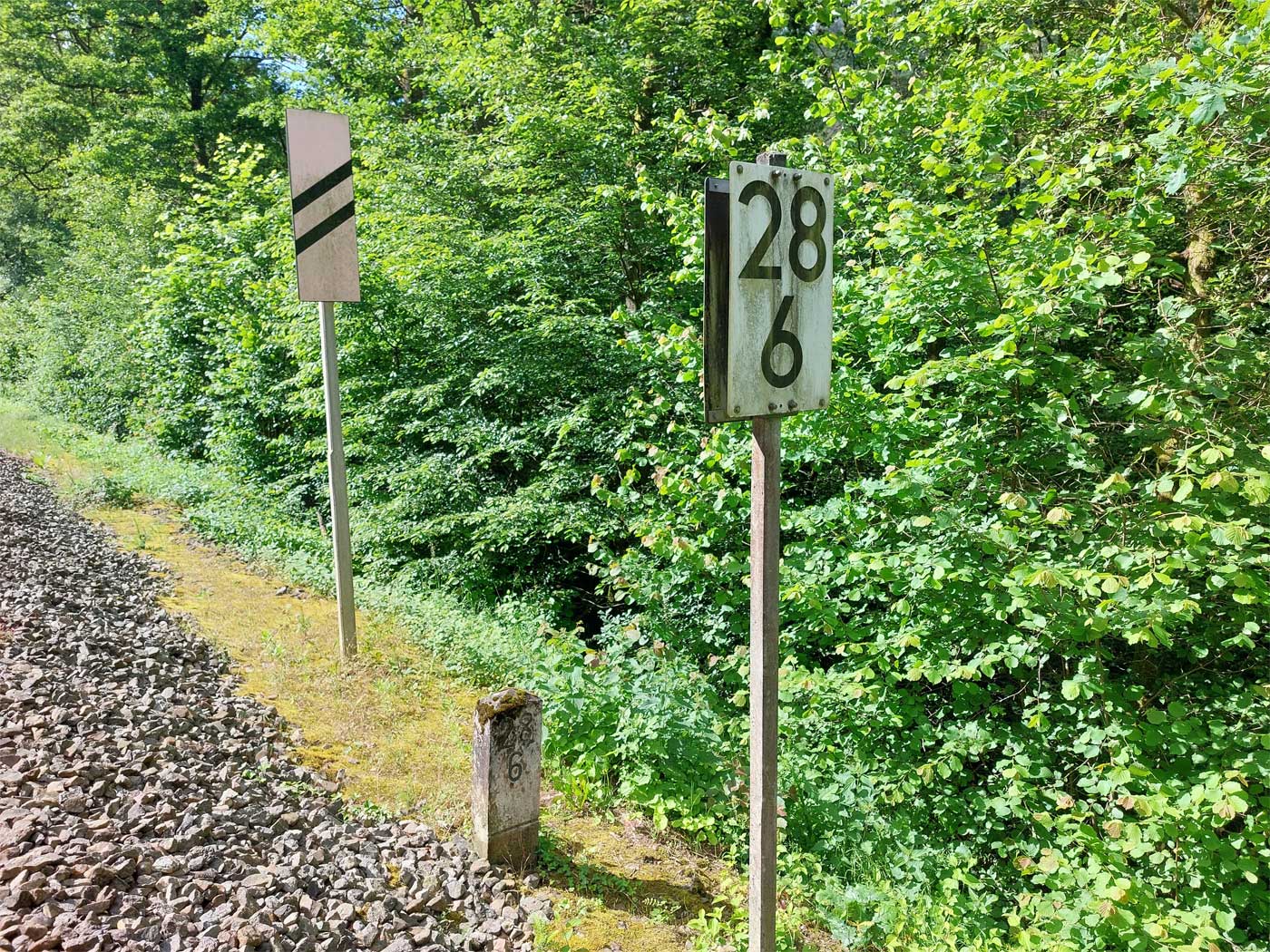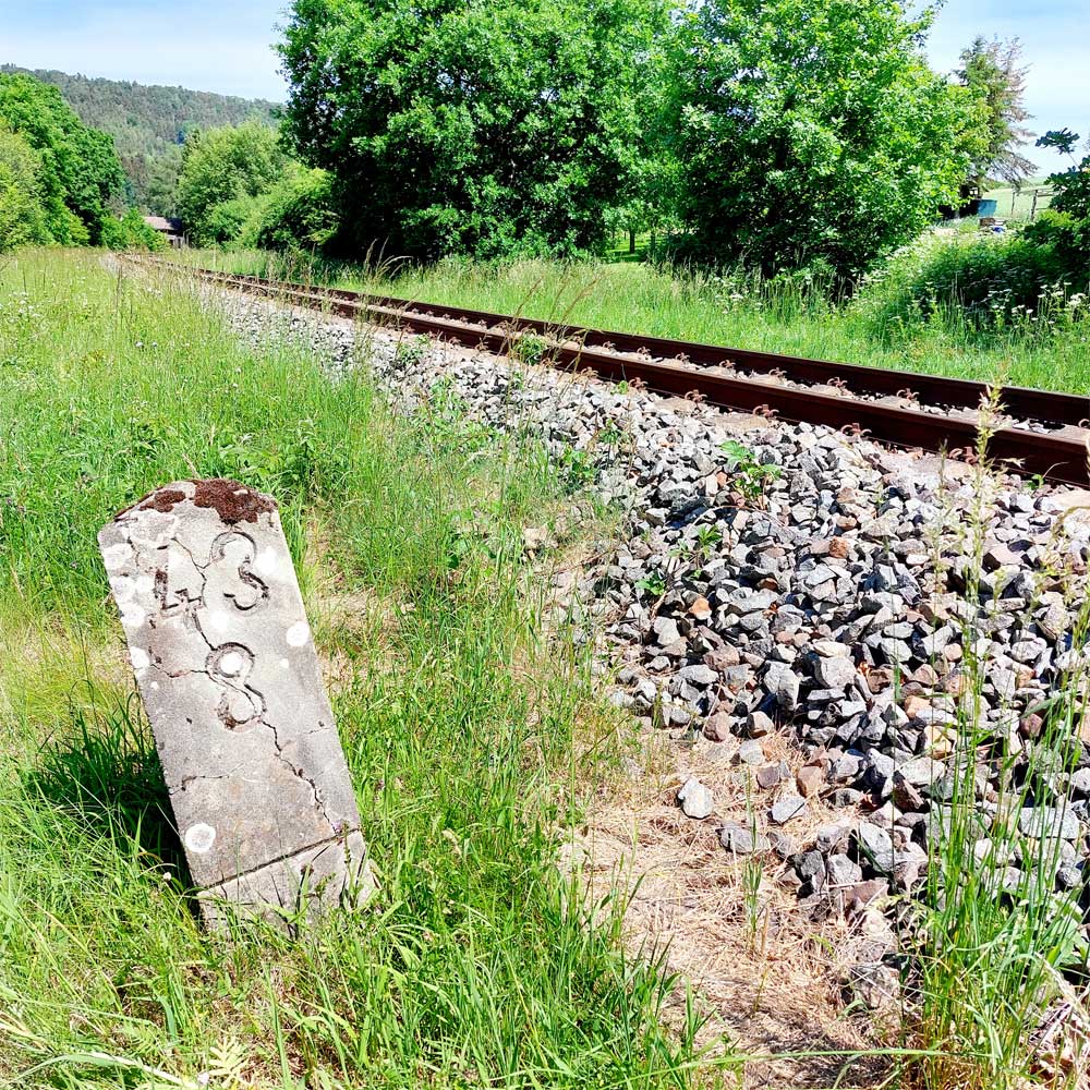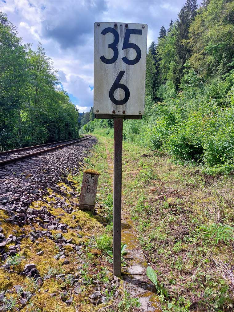 Im Hintergrund die Strecke Eutingen im Gäu - Freudenstadt Hbf - Schiltach mit der Kilometertafel 2,2