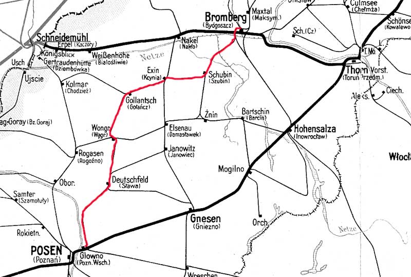 Posen Ost (Glowno) 0,0 - Deutschfeldhof 30,094 - Schokken 34,815 - Eichenbrück 51,358 - Exin 85,642 - Altburgund (Schubin) 103,370 - Rbd Grenze Posen/Danzig 122,430 - Bromberg Hbf 127,800