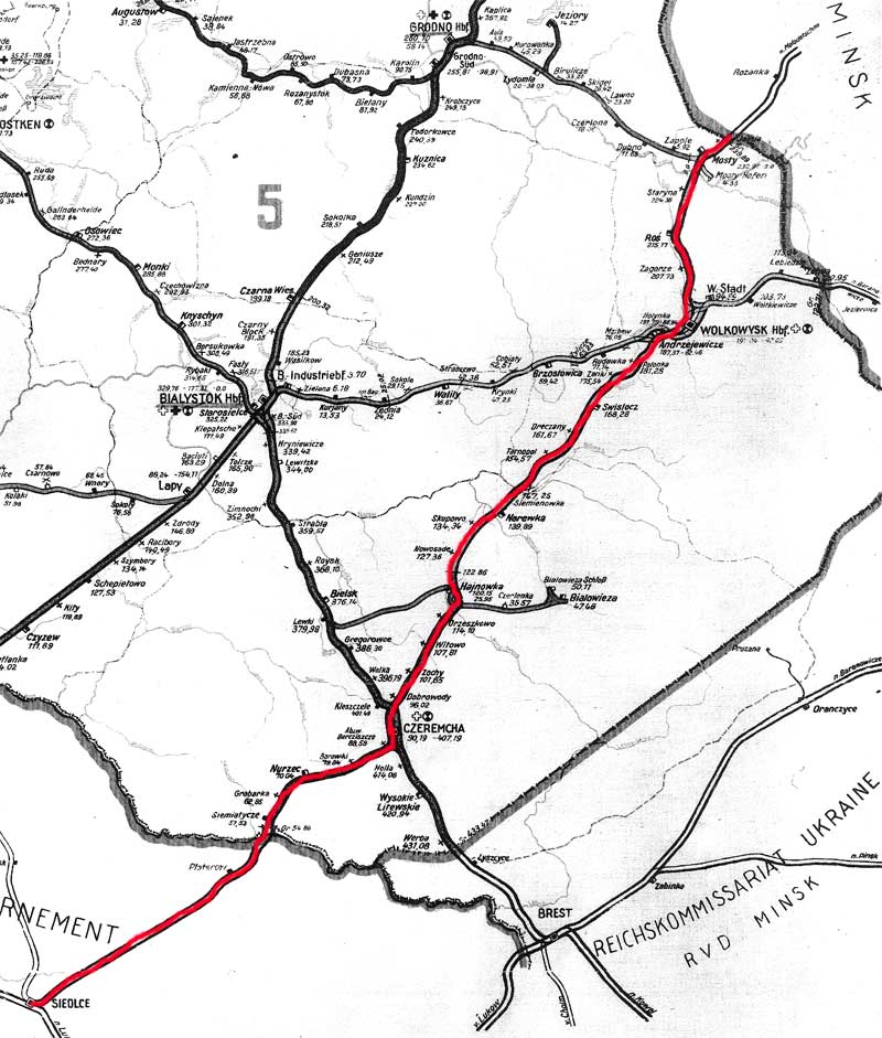 Siedlce 0,0 - Grenze General-Gouvernement/Gebiet Bialystok 54,86 - Czeremcha 90,19 - Hajnowka 120,15 - Wolkowysk Hbf 197,04 - Mosty 232,90 - Grenze Gebiet Bialystok/Reichskommisariat Ostland RVD Minsk 239,89 - Molodetschno (1944)