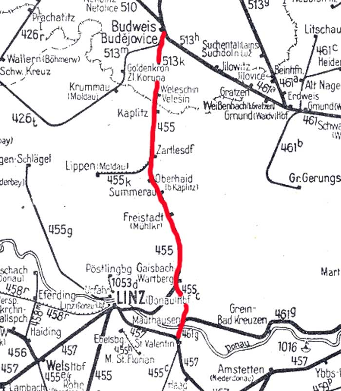St. Valentin 0,0 - Mauthausen 7,280 - Gaisbach-Wartberg 20,191 - Summerau 55,905 - Zartelesdorf 69,781 - Kaplitz 86,504 - Grenze Deutschland/Protektorat Böhmen und Mähren - Weleschin/Velešín 93,731 - Budweis/Budějovice 119,750