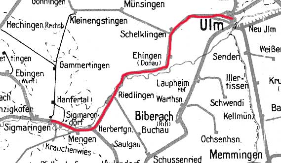 Stadt 197,56 mit Zweigstrecke (Stuttgart Hbf 0,0) - Ulm Hbf 93,98 - km 94,950 Landesgrenze Württemberg/Bayern - (= km 85,001 - Neu-Ulm 83,77 - Augsburg Hbf 0,0) |