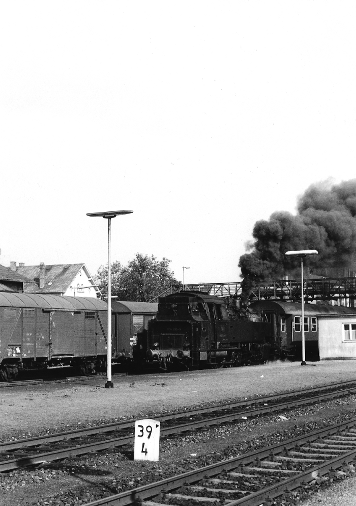 064 295 mit einer großen Rauchfahne bei der Ausfahrt Bf Kirchenlaibach am km 39,4