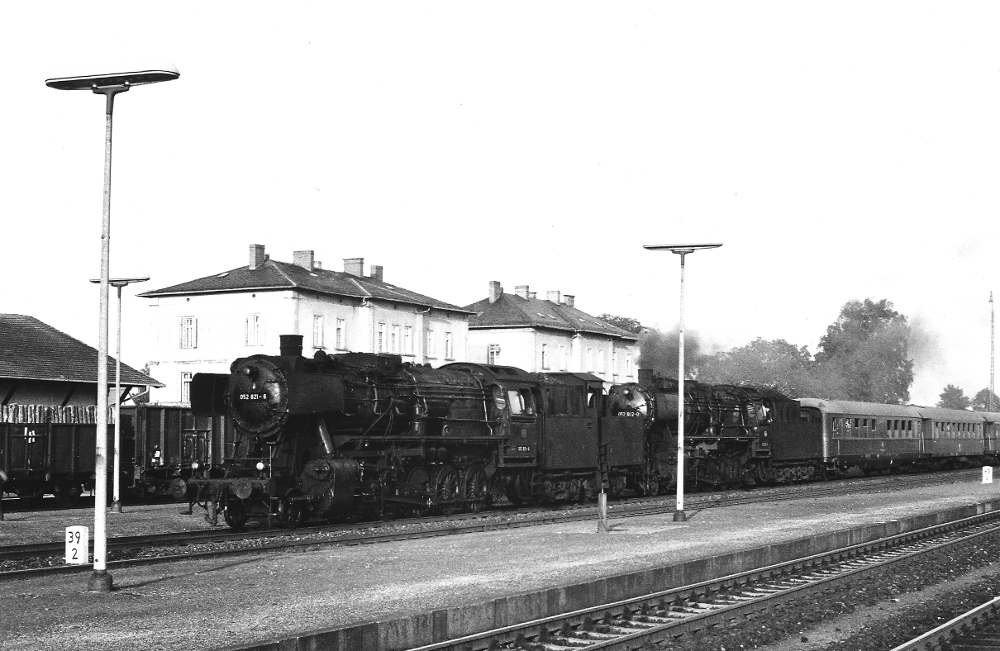 052 821 vom Bw Weiden und die 052 602, die bis zum 30.9.1970 offiziell zum Bw Kaiserslautern gehörte, mit einem Militärgüterzug