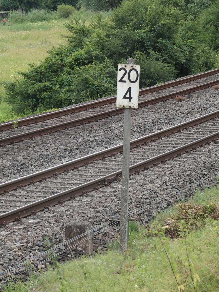 km 21,6 (Tafel im Hintergrund); km 21,7 (Stein rechts neben den Gleisen) und km 21,8 (Stein im Vordergrund) zwischen Löhnberg und Weilburg - Blick Richtung Wetzlar